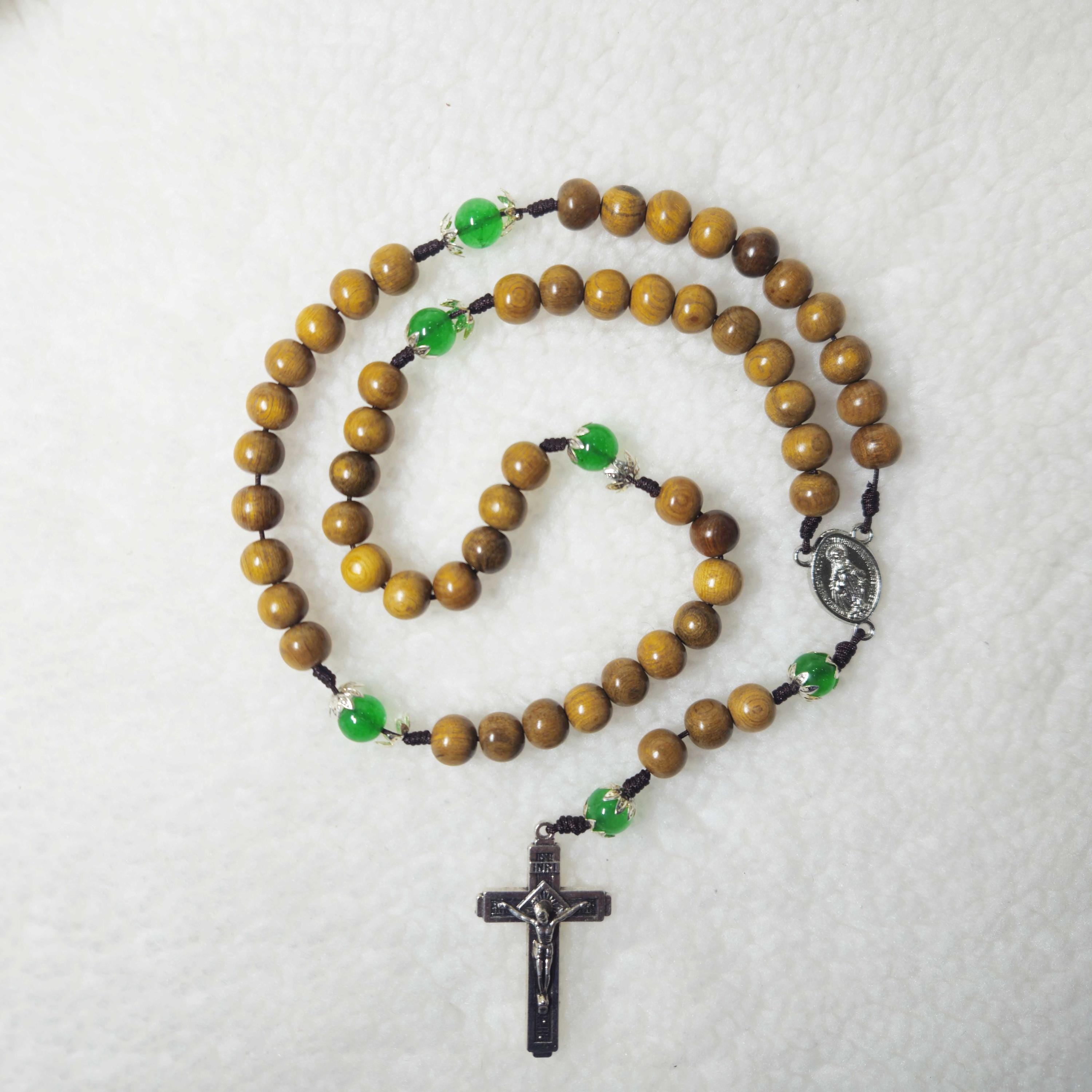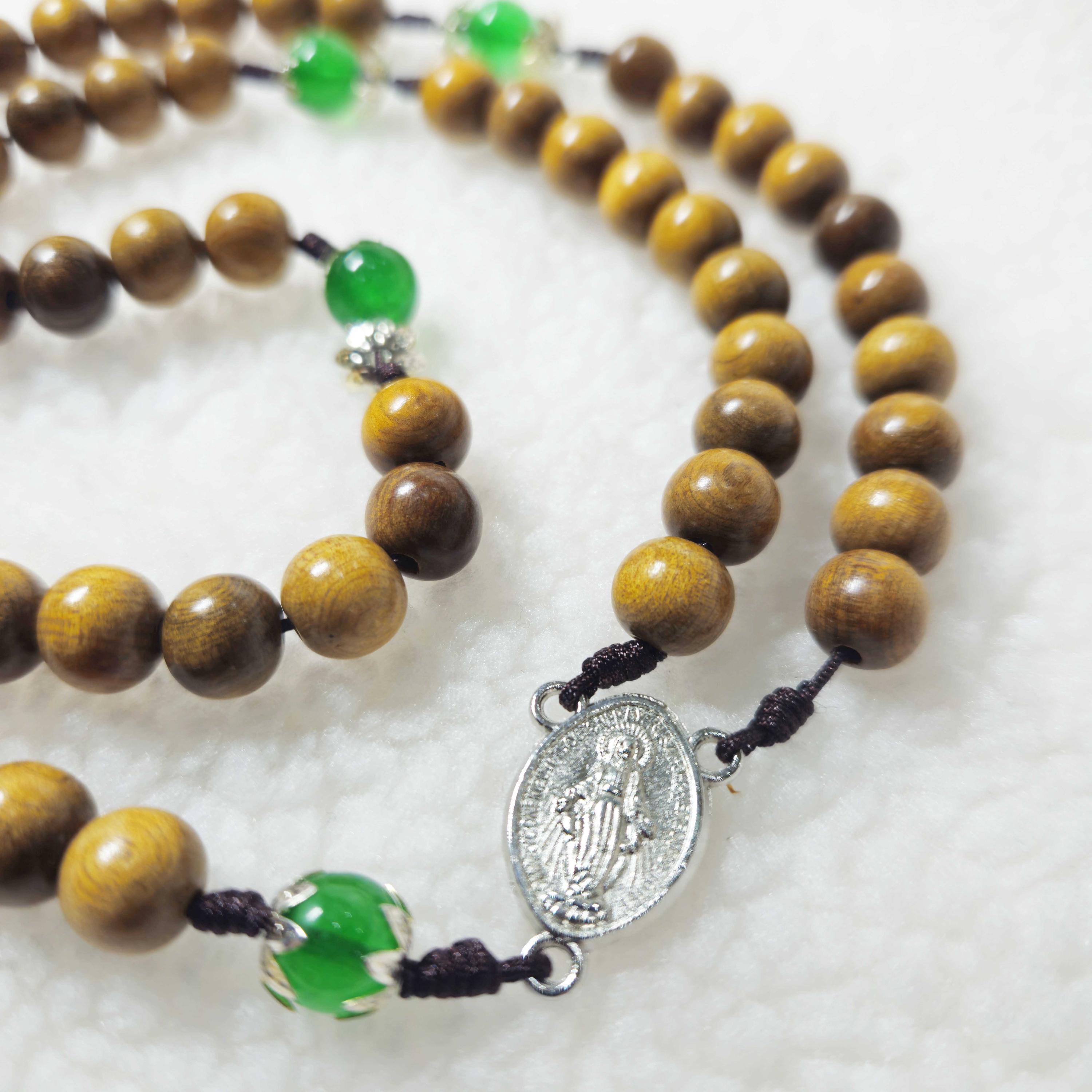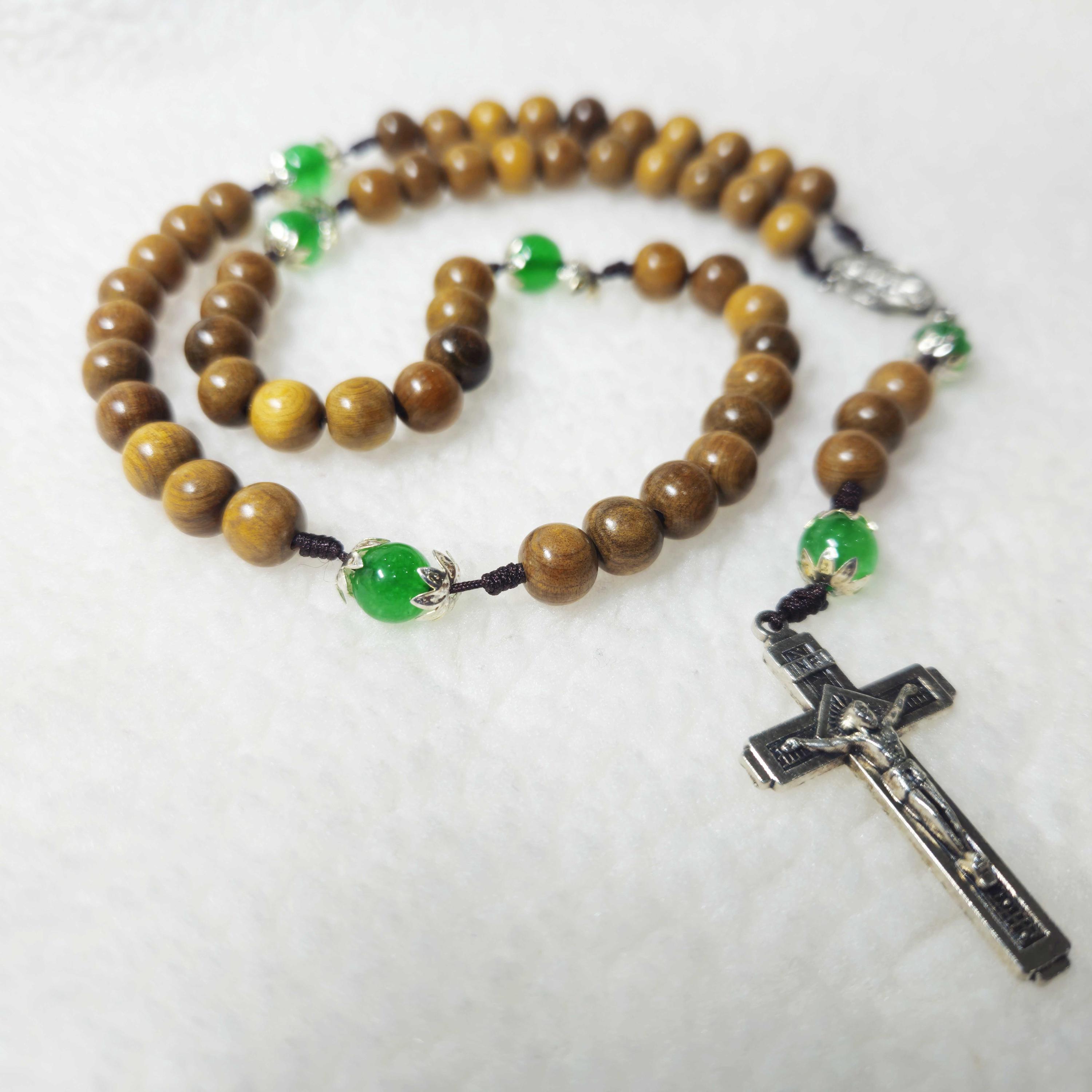 Immerse yourself in the craftsmanship of this intricately fashioned Catholic rosary, distinguished by its remarkable elegance and unique nature. Formed from 8mm beads of green cypress wood and accompanied by 8mm gemstone beads, this rosary truly encapsulates devotion. Enhanced by a 1.6-inch crucifix, the beads are expertly threaded and carefully knotted onto micro cord, ensuring both lasting durability and captivating visual appeal.