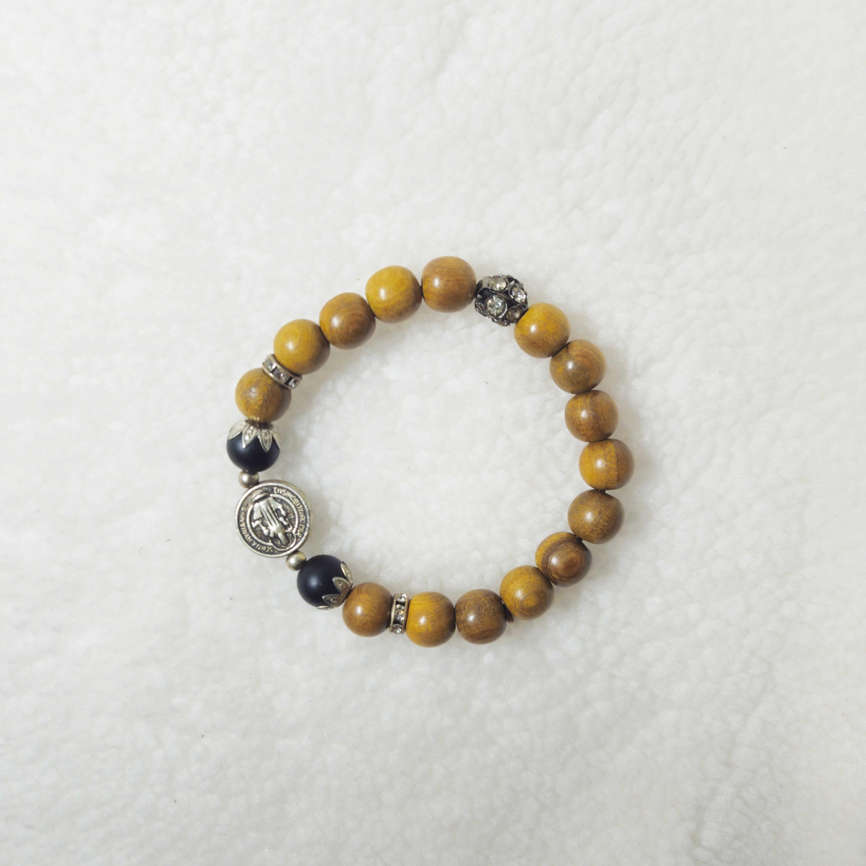 Yellow Cypress Wood Catholic Bracelet with Black Stone Beads | Handmade Prayer Beads for Kids & Teens, Rosary Gift
