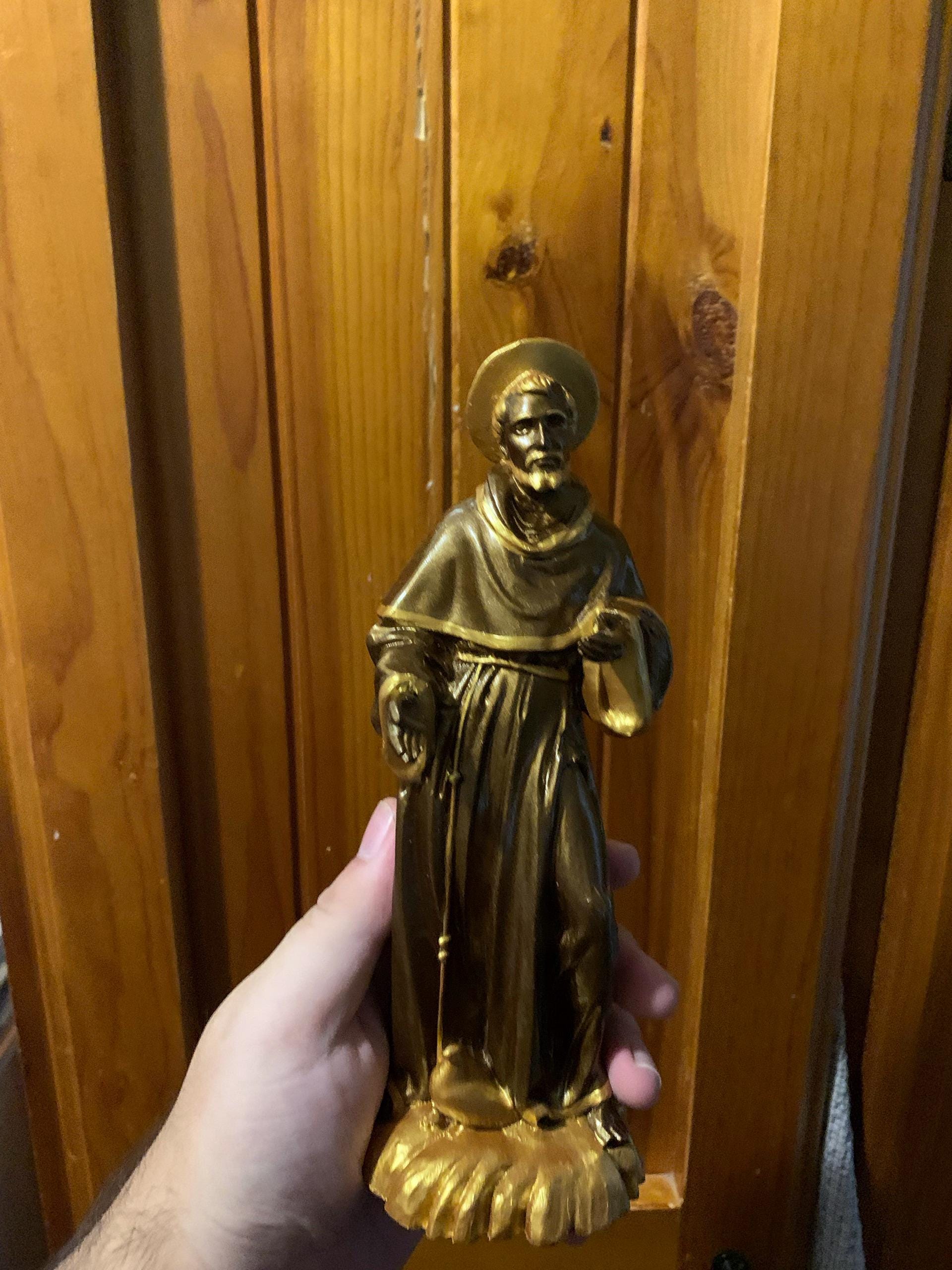 Discover the timeless spirit of compassion with our 'Saint Francis of Assisi Wooden Statue Vintage Style.' Meticulously crafted, this wooden statue seamlessly blends spirituality with artistry. The hand-painted finish, adorned with an antique bronze faux touch, imparts a vintage charm to elevate your home decor. Ideal for those seeking unique gifts or personalized items, this statue holds deep meaning within the realm of religious expression. Elevate your living space with the enduring allure and spiritual significance intricately woven into every detail of this carefully handcrafted piece. Tailored for enthusiasts of unique home decor and gifts, the 'Saint Francis of Assisi Wooden Statue Vintage Style' represents a harmonious blend of devotion and masterful artistry. Explore the exquisite beauty of this statue, a perfect addition to your collection or a heartfelt gift for those who value finely crafted religious items.