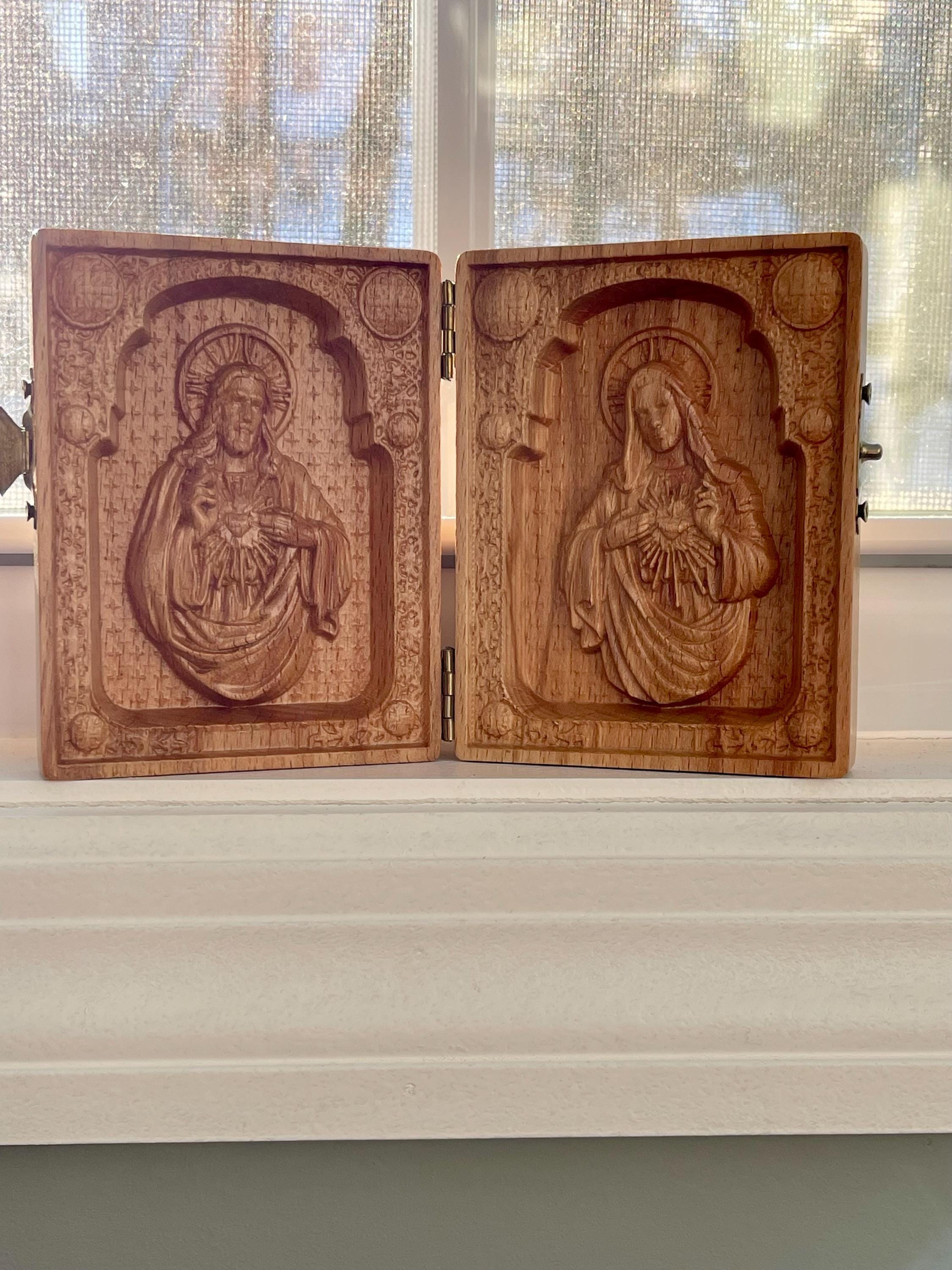 Carefully carved and printed on natural wood, this diptych makes a meaningful addition to any Catholic home, personal altar, or prayer space. It is also a heartfelt religious gift for First Communion, Confirmation, weddings, house blessings, or any occasion that celebrates faith and family.
