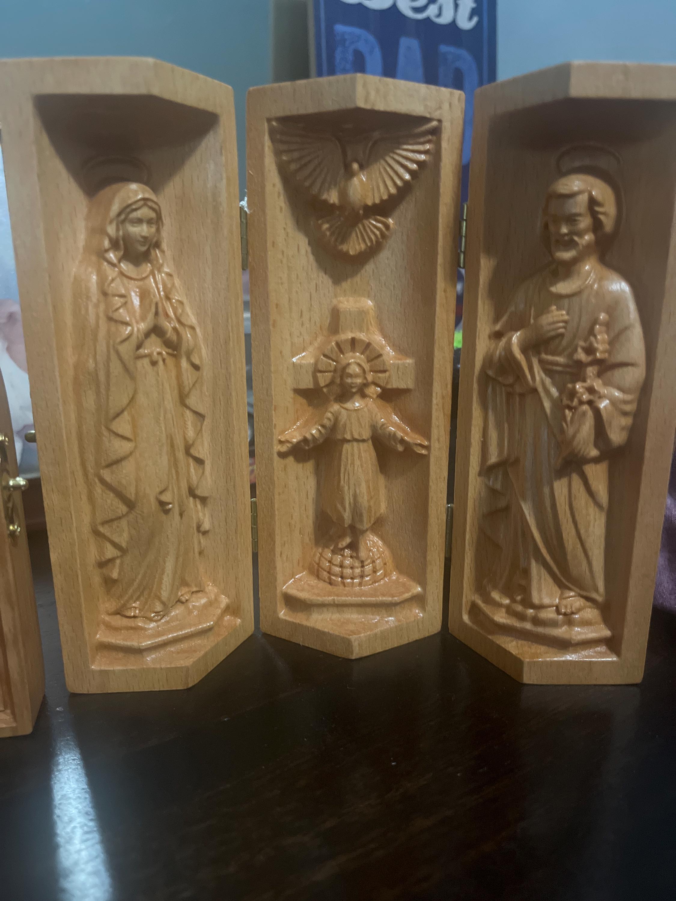 Carved from natural wood and created with devotion, this triptych is a meaningful addition to your prayer corner, home altar, or sacred space. It also makes a heartfelt religious gift for baptisms, baby showers, Christmas, or new parents seeking to surround their child with faith.