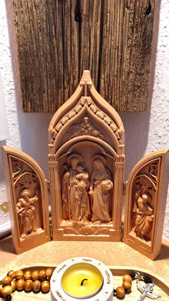 Made from solid wood and finished with an elegant antique touch, this Catholic triptych is perfect for your prayer room, home altar, or sacred space. It serves as a heartfelt reminder of the blessings of family, faith, and tradition.