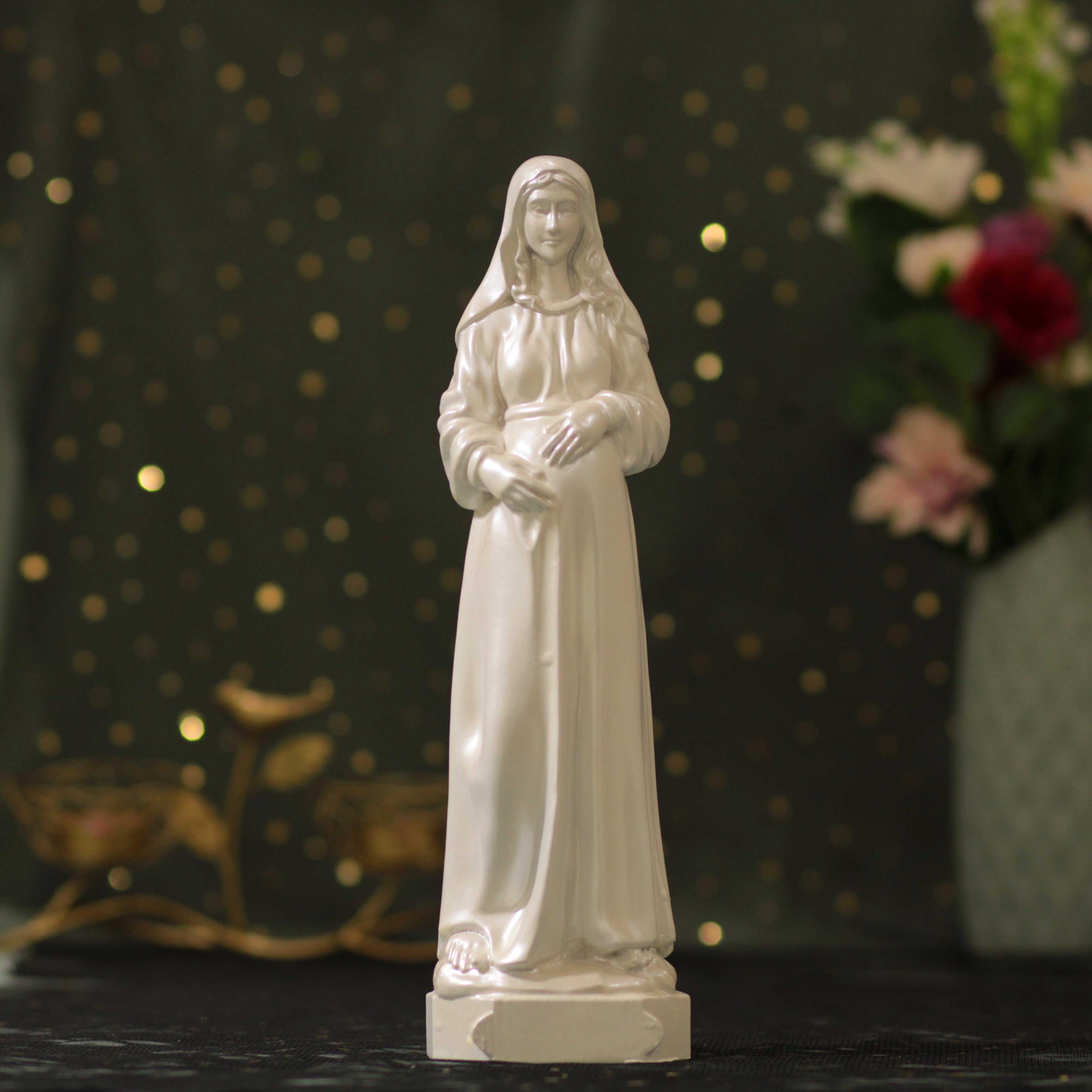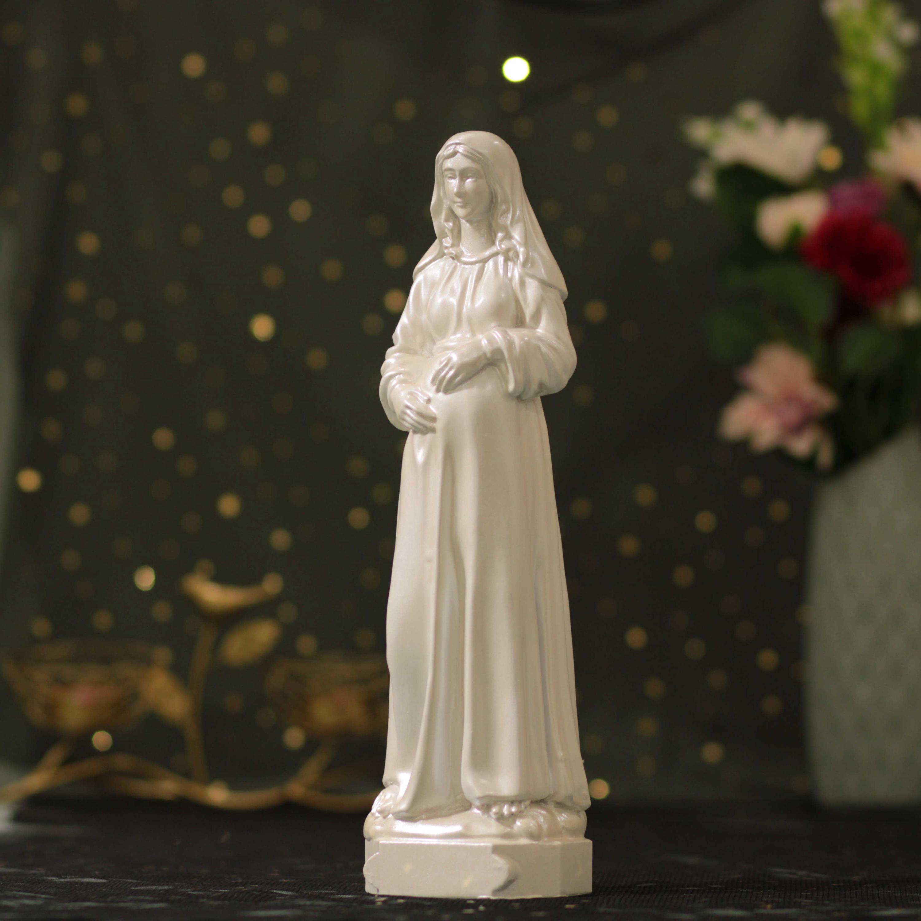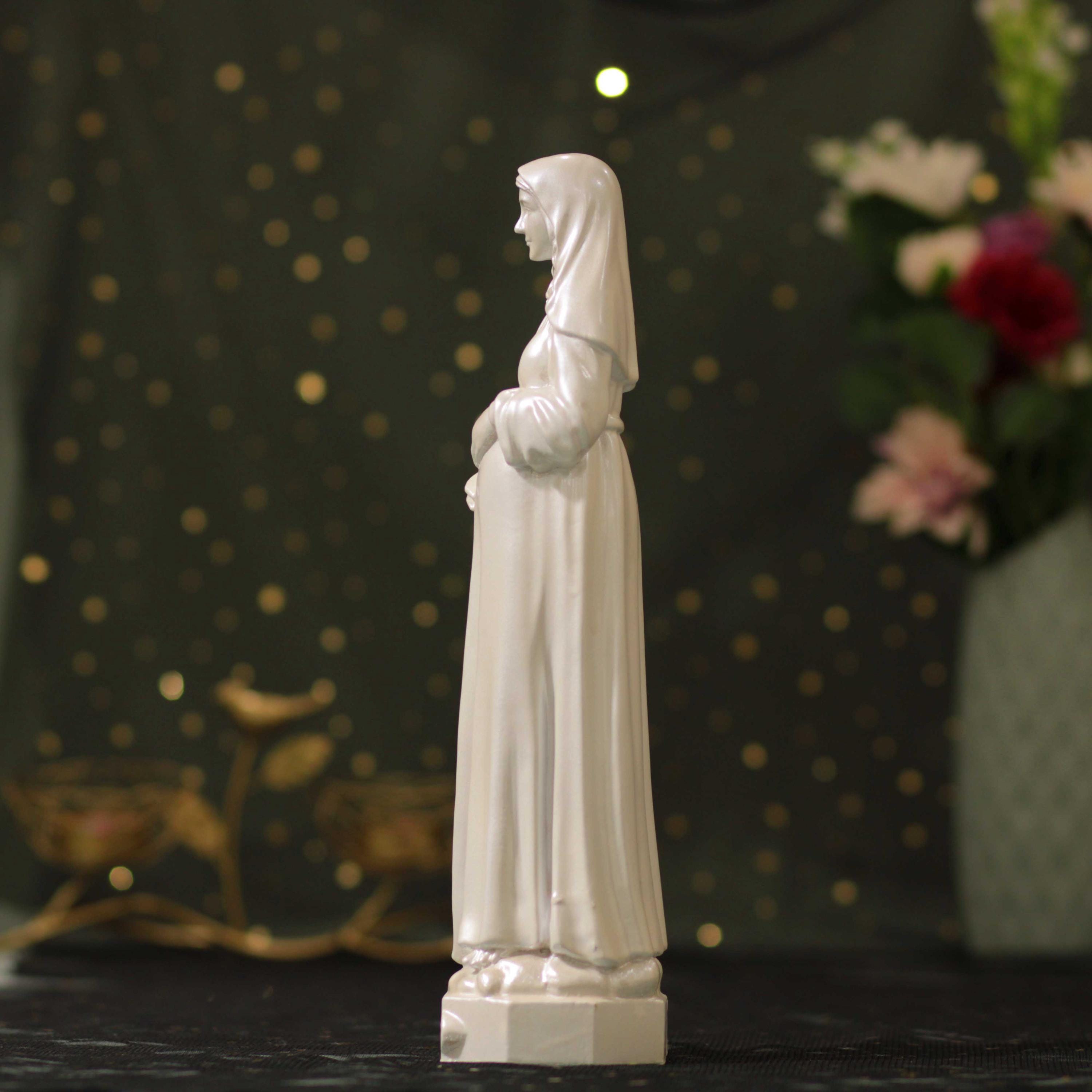 Perfect as a heartfelt Catholic gift for expecting mothers, baby showers, baptisms, confirmations, weddings, or as a meaningful centerpiece for your prayer room or home altar. The pearl white finish enhances the statue’s serene expression and detailed craftsmanship, making it a timeless addition to any sacred space.