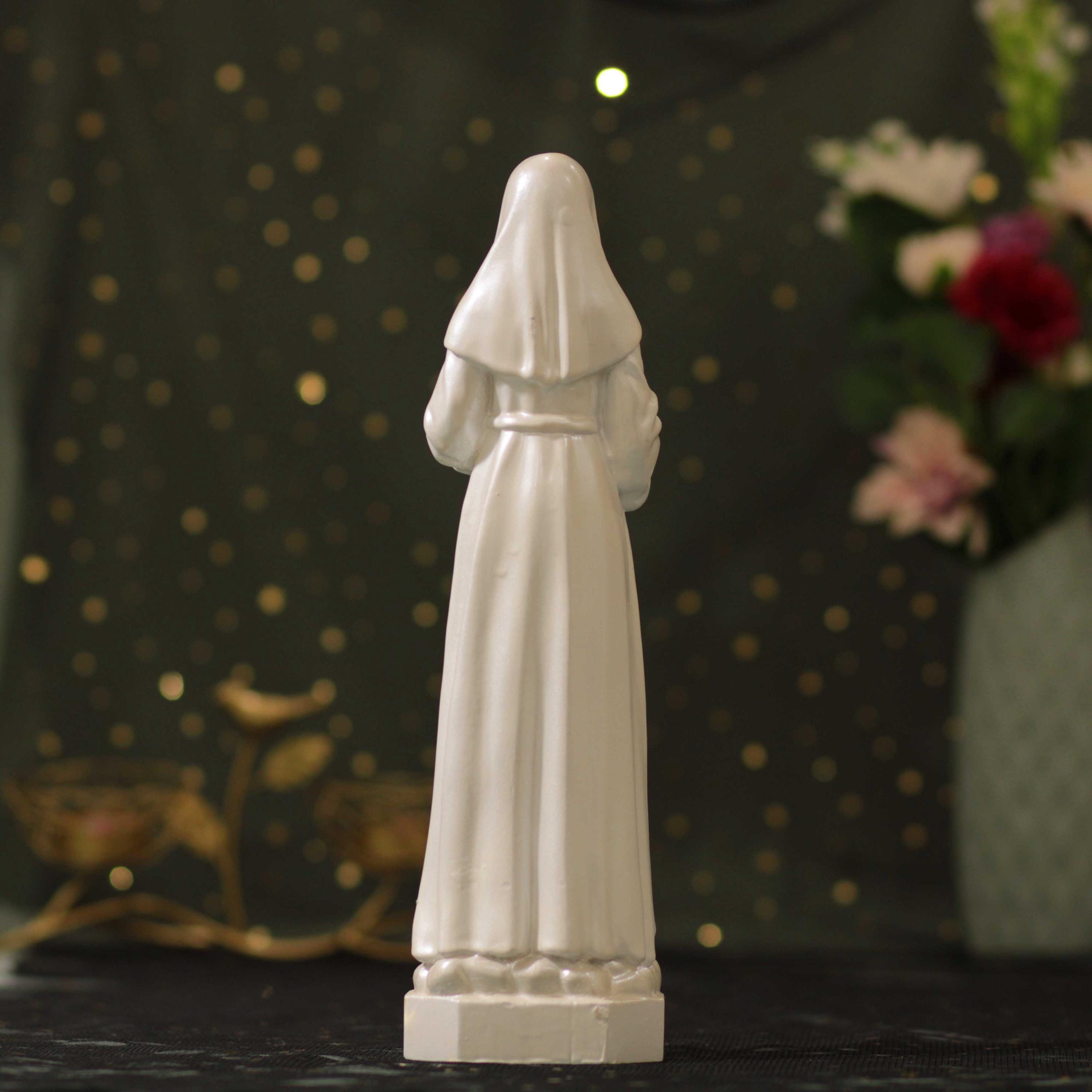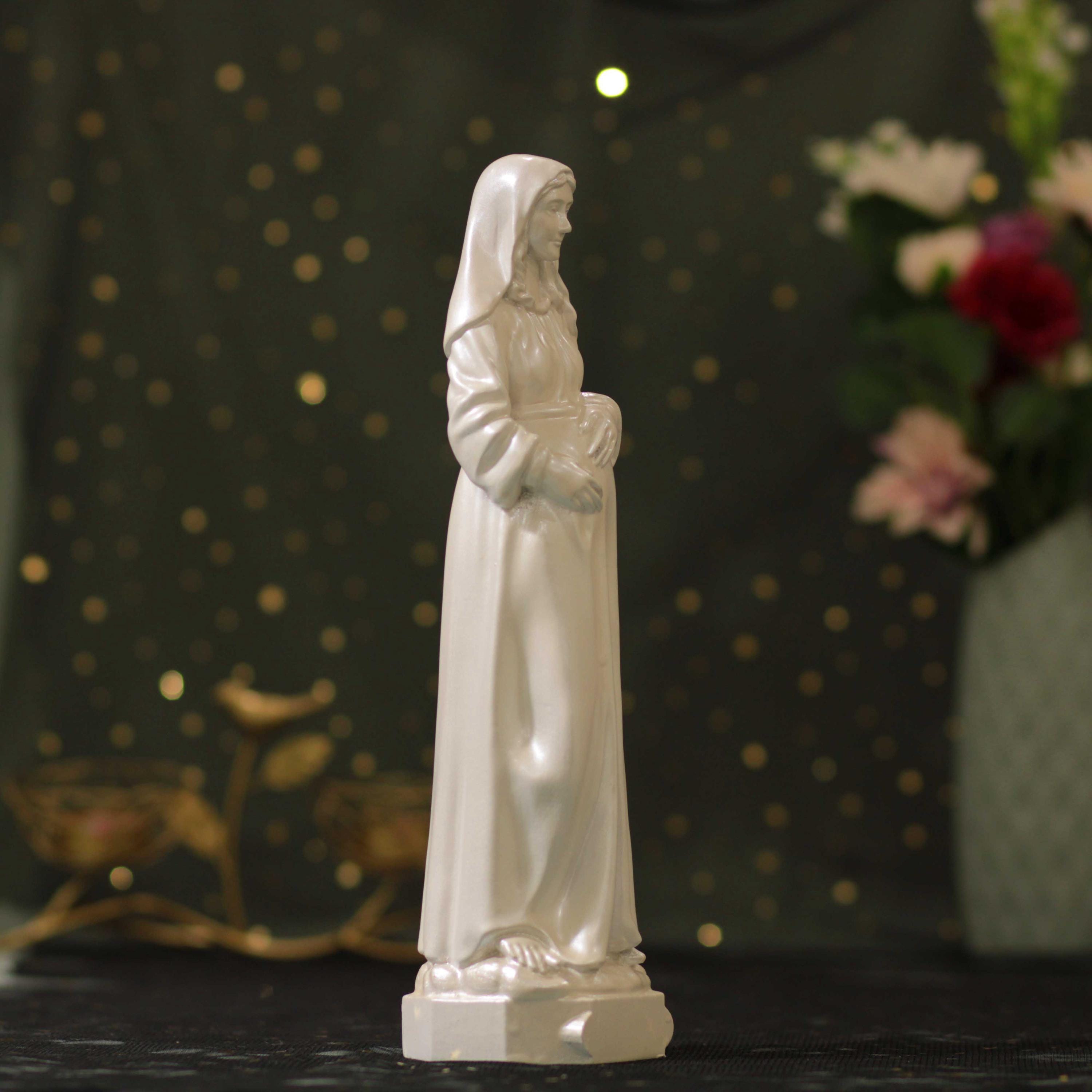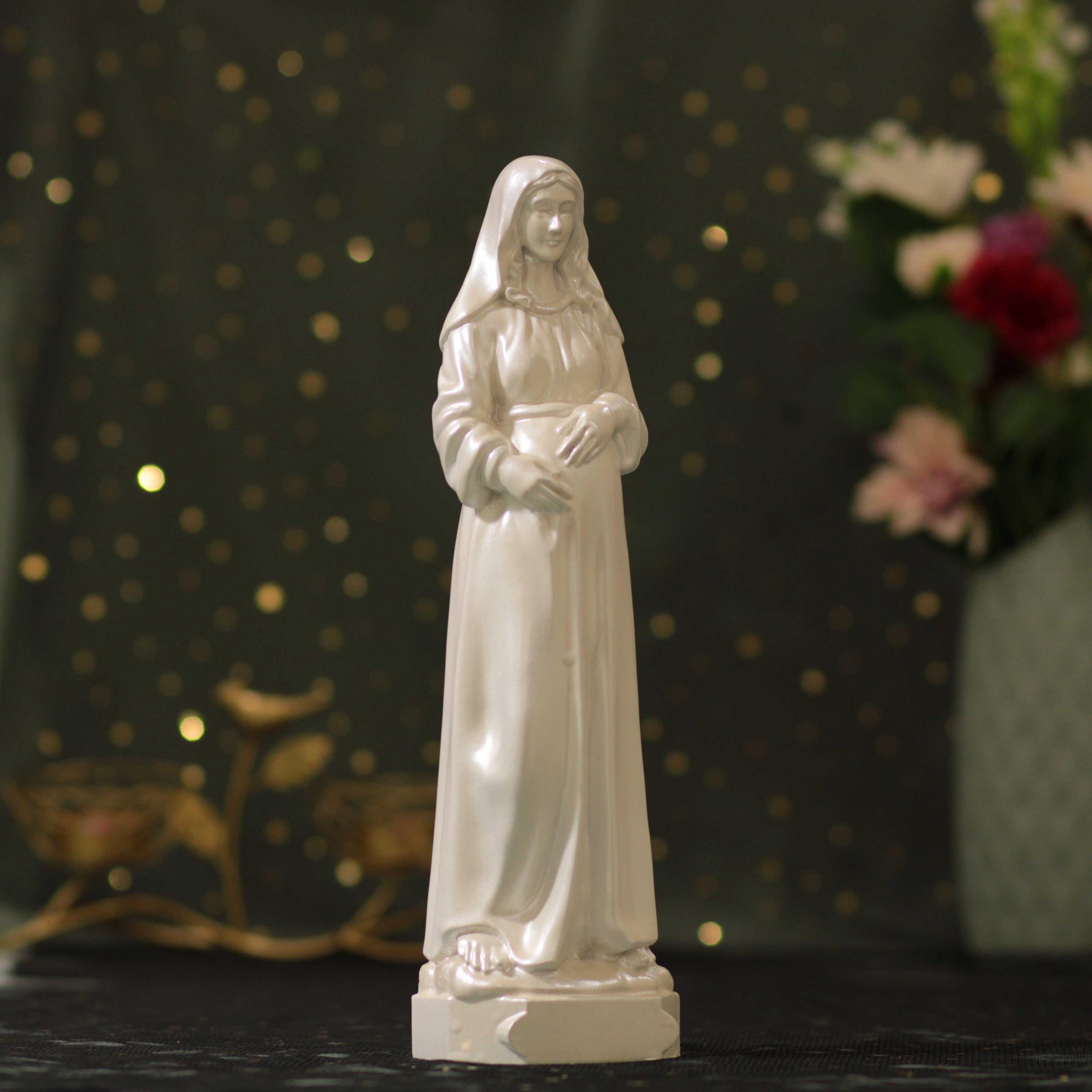 Perfect as a heartfelt Catholic gift for expecting mothers, baby showers, baptisms, confirmations, weddings, or as a meaningful centerpiece for your prayer room or home altar. The pearl white finish enhances the statue’s serene expression and detailed craftsmanship, making it a timeless addition to any sacred space.