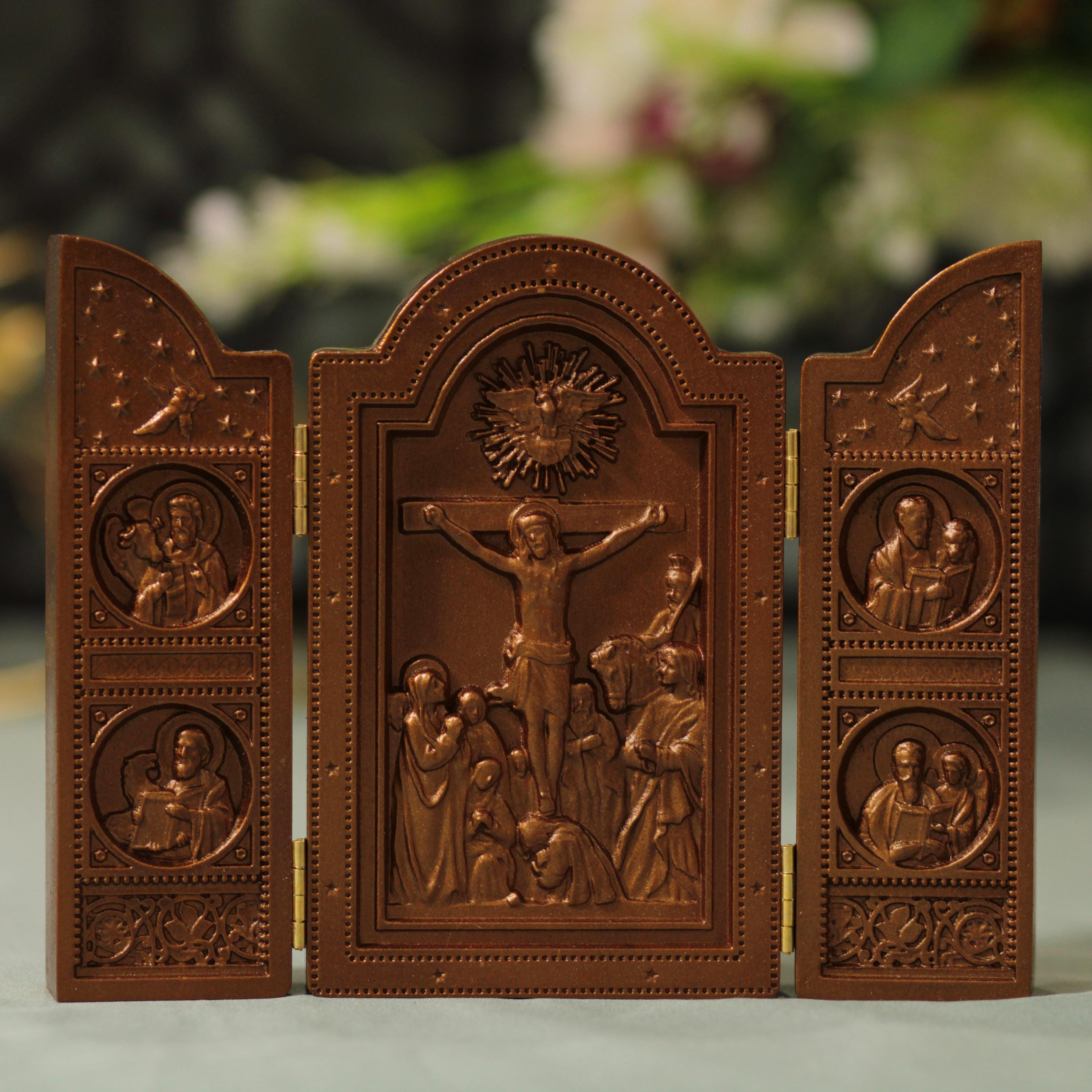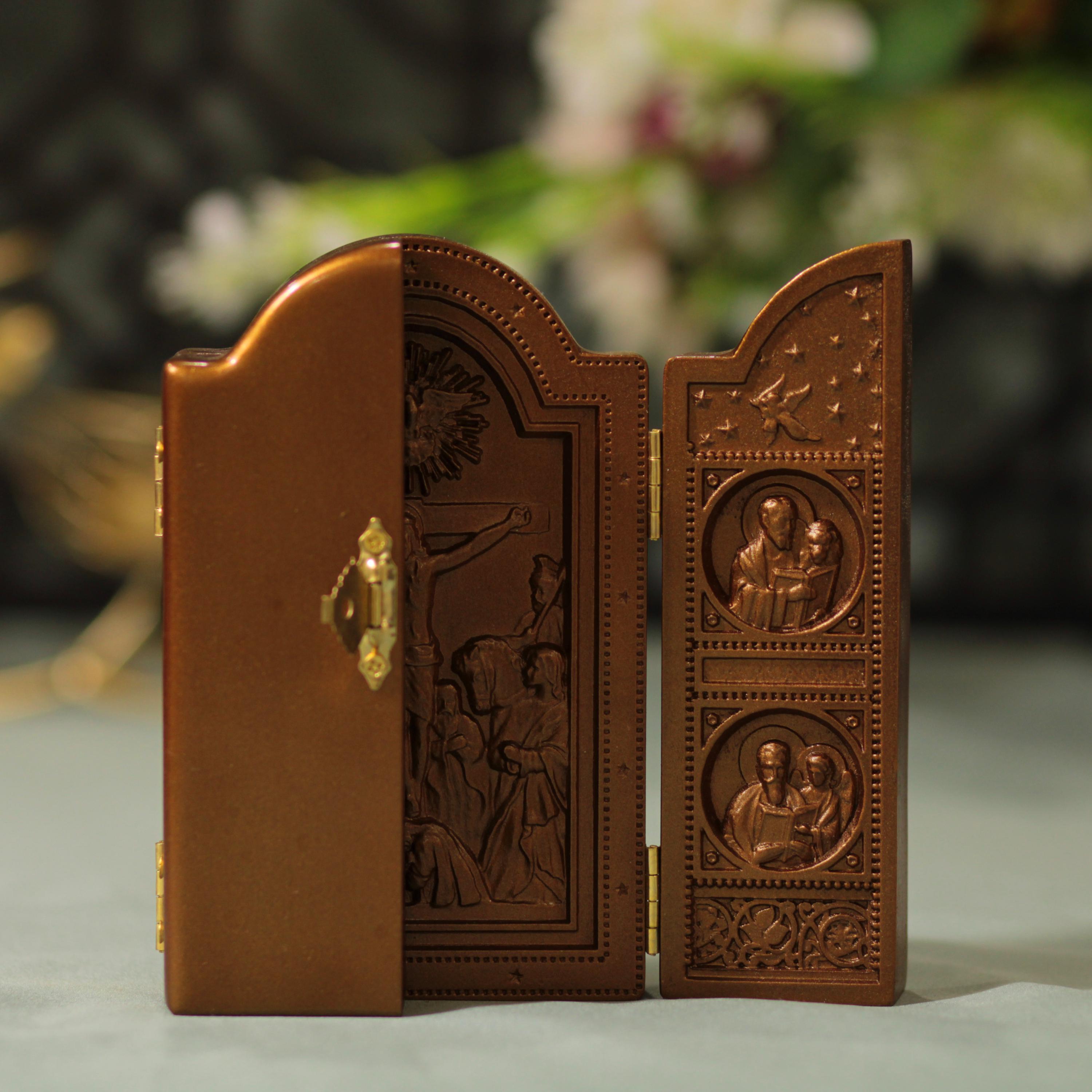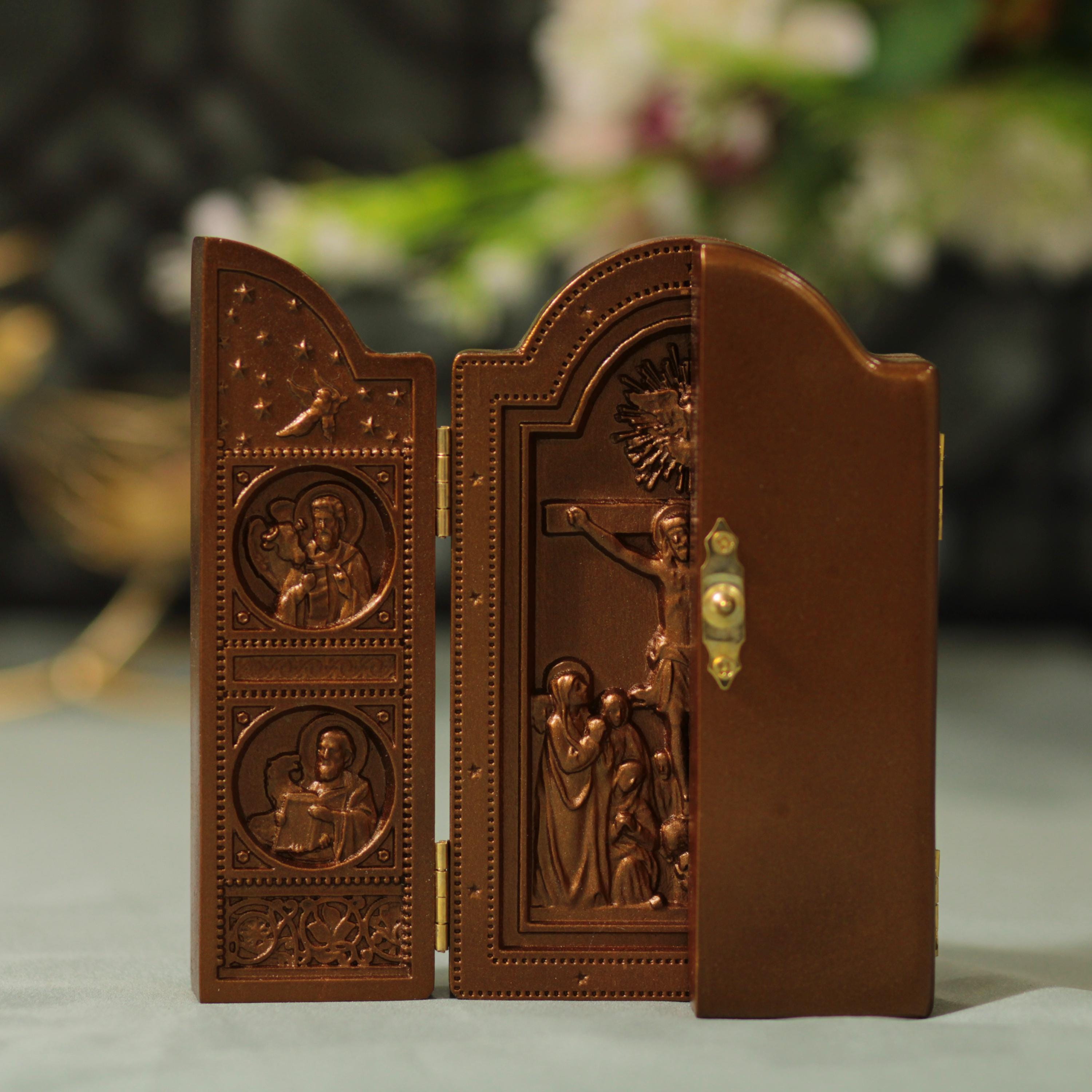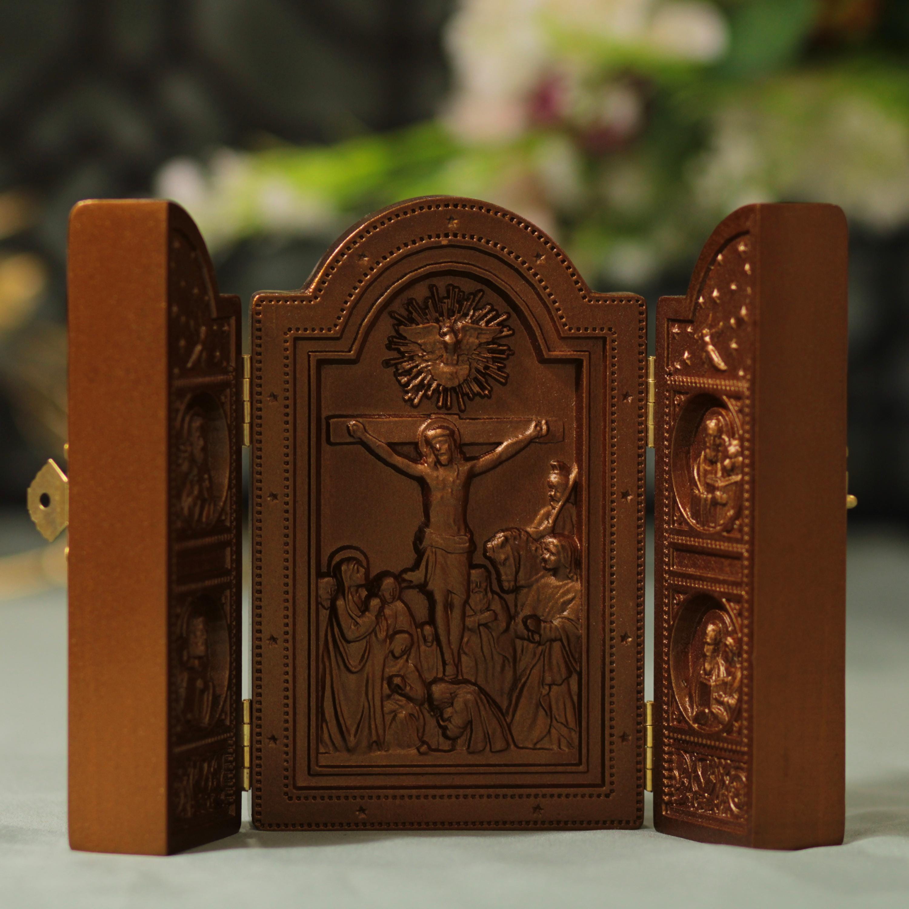 Bring the beauty of faith into your home with this Catholic wooden triptych featuring the Crucifixion of Christ and the Four Evangelists in a timeless antique style. Hand-carved with devotion, this Christian icon is perfect for prayer corners, home altars, or as a meaningful religious gift for baptisms, confirmations, weddings, or house blessings. The intricate design and vintage finish make it an inspiring piece of sacred art, reflecting both tradition and faith. A treasured addition for Catholic families and collectors of devotional artwork.