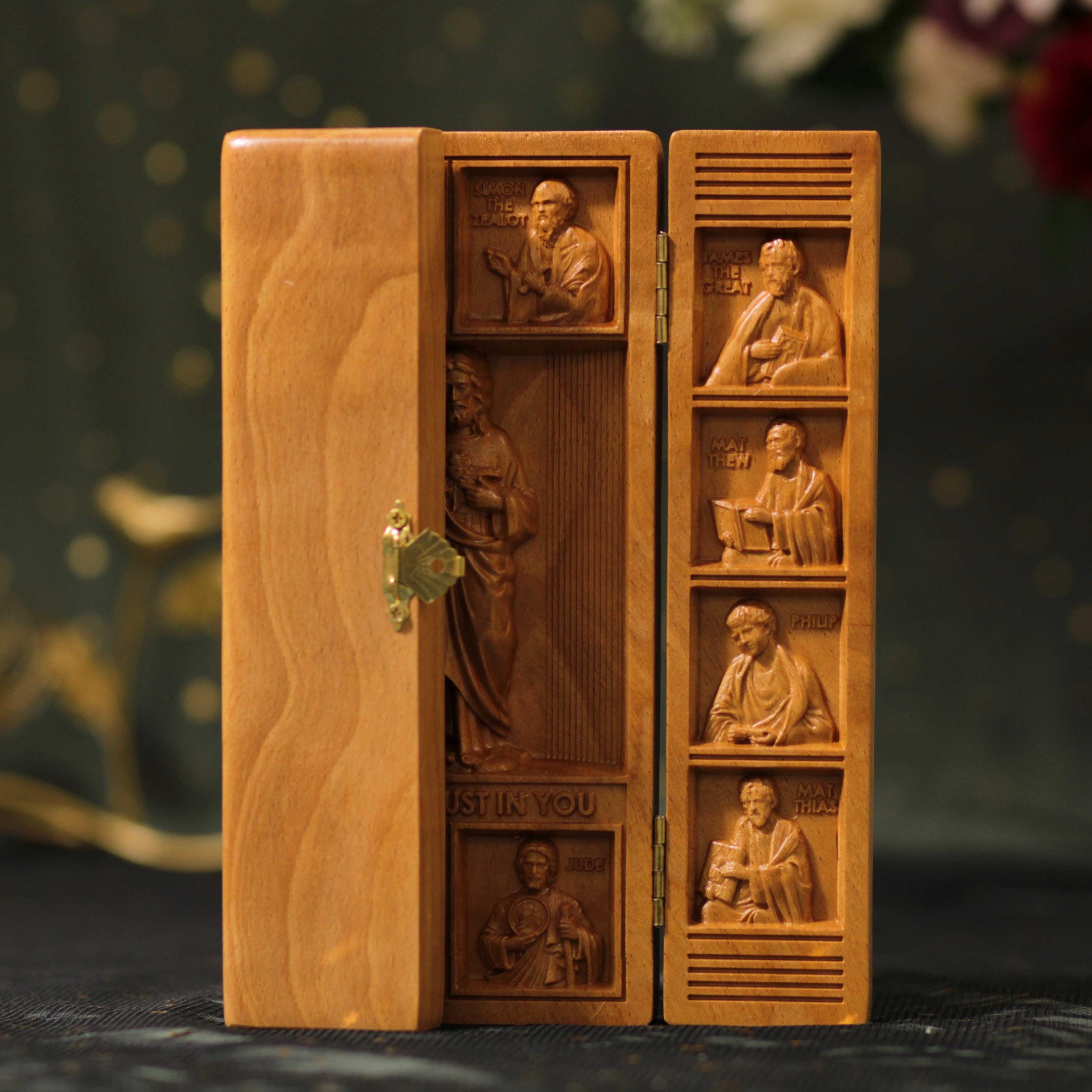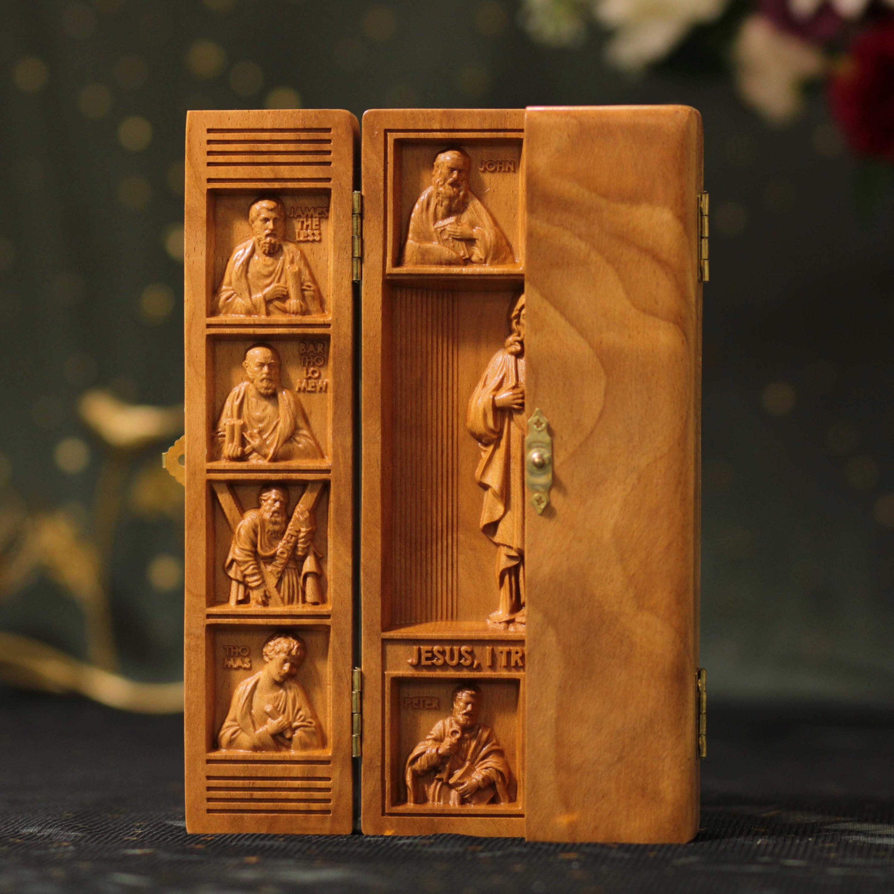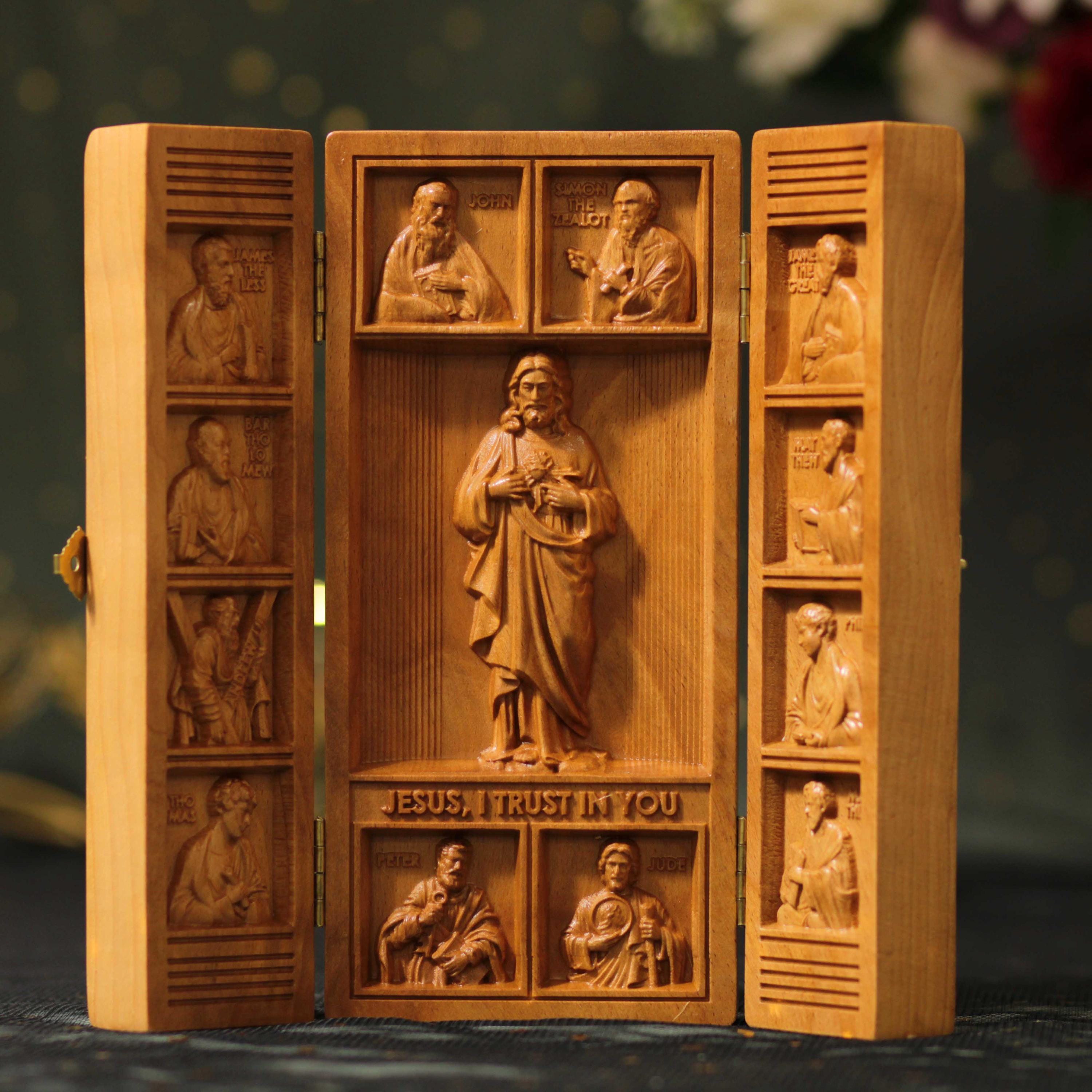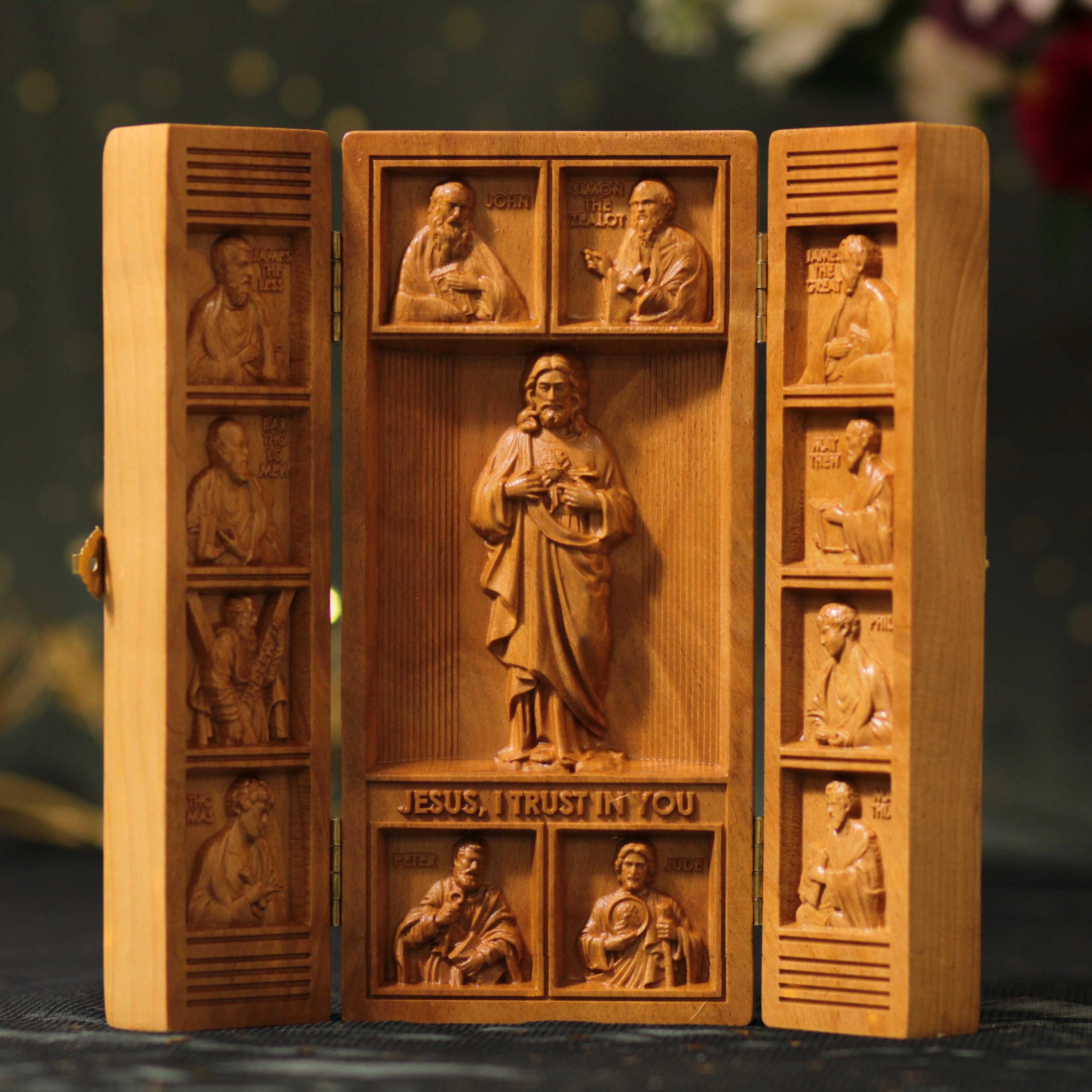 Bring a piece of faith and devotion into your home with this beautifully crafted Sacred Heart of Jesus Triptych featuring the 12 Apostles. Hand-carved from high-quality wood, this Catholic wall art is perfect for prayer corners, home altars, or as a thoughtful gift for loved ones who cherish Christian traditions. Each panel reflects intricate details and reverence, making it not only a spiritual treasure but also a stunning decorative piece. Ideal for Christmas, Baptism, First Communion, or any special occasion.