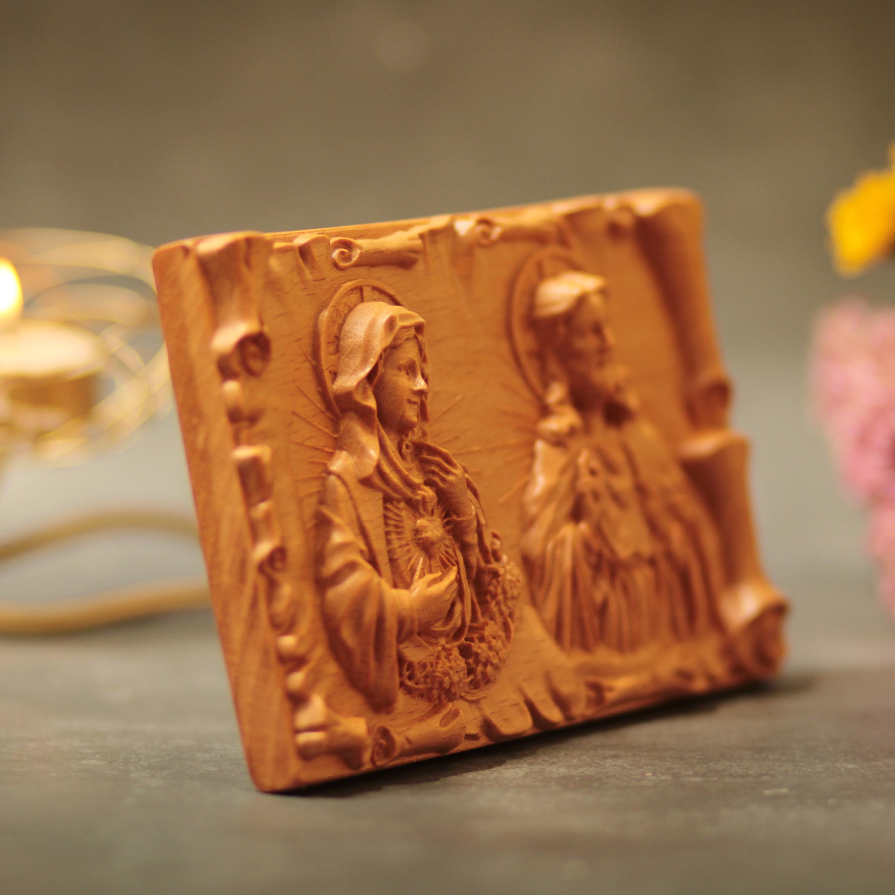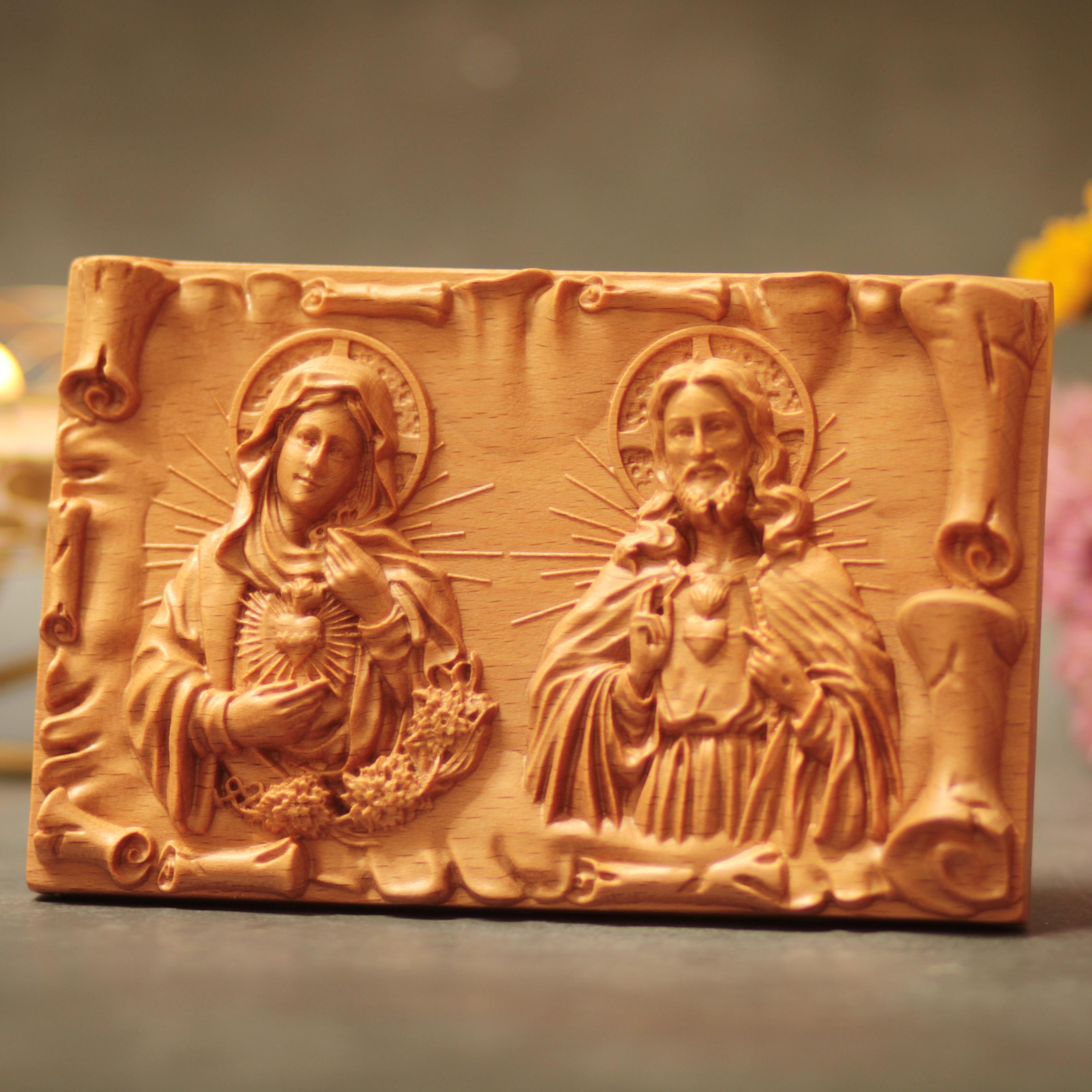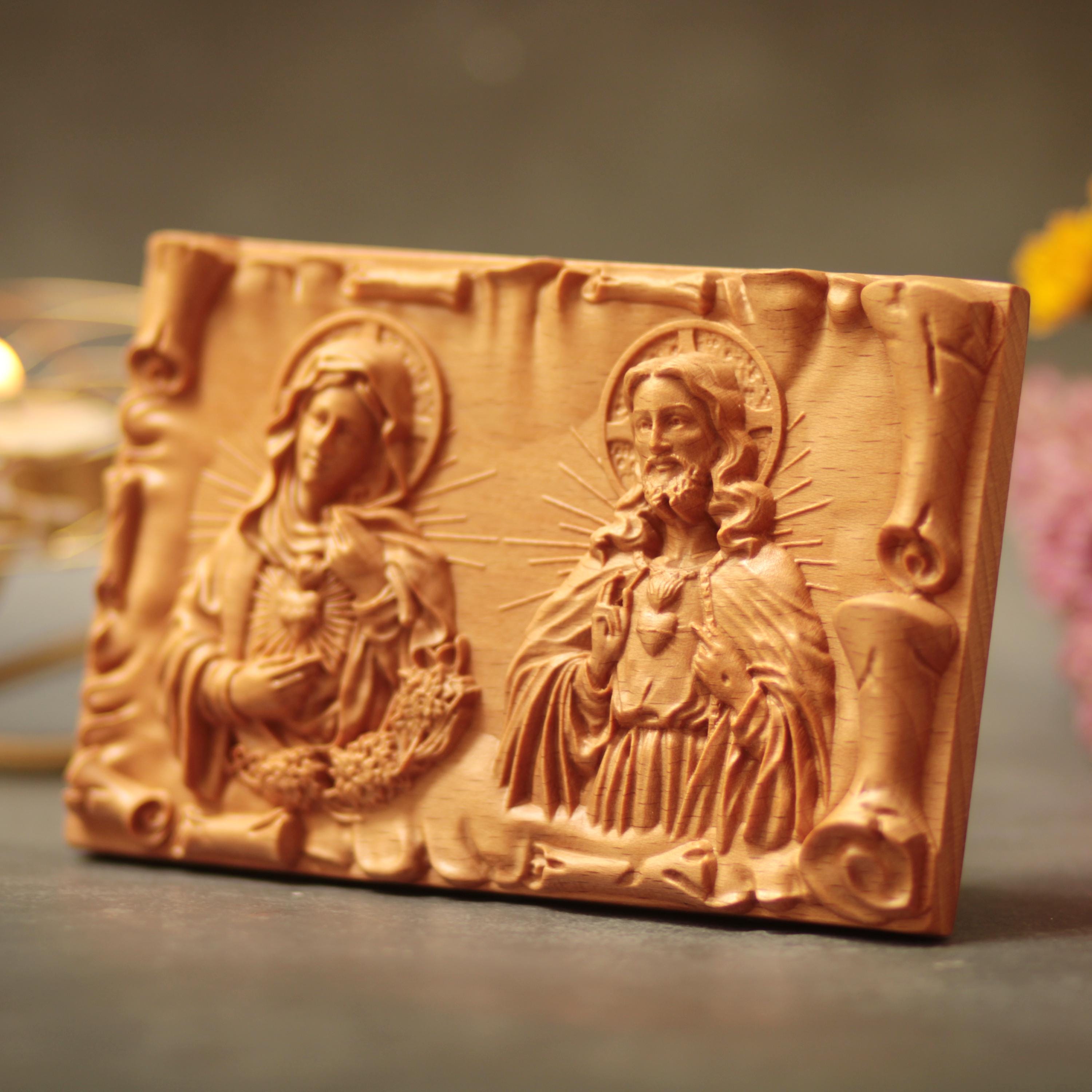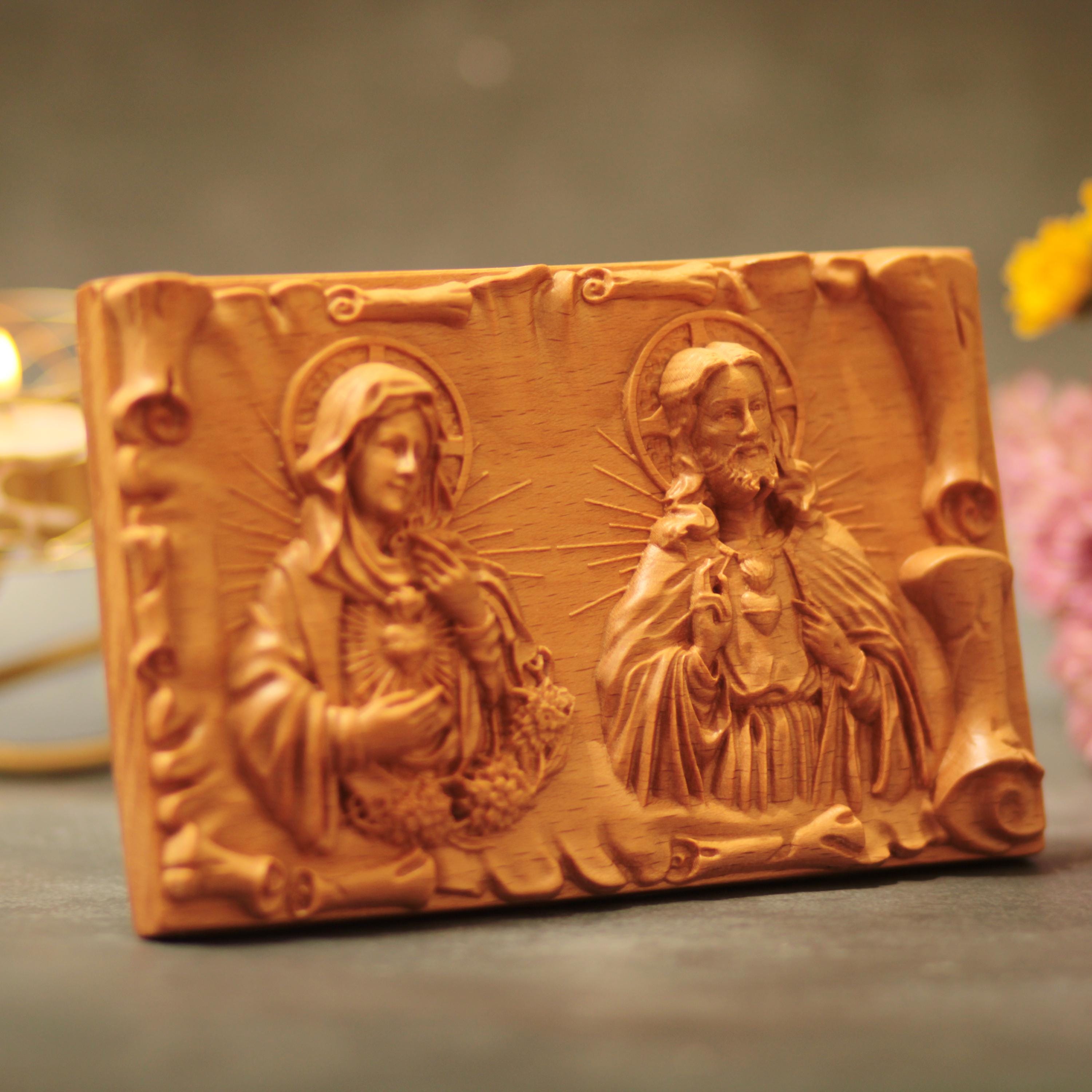 Sacred Heart of Jesus & Immaculate Heart of Mary Wooden Desk Art | Catholic Gift | Home Altar Decor | Christian Table Icon