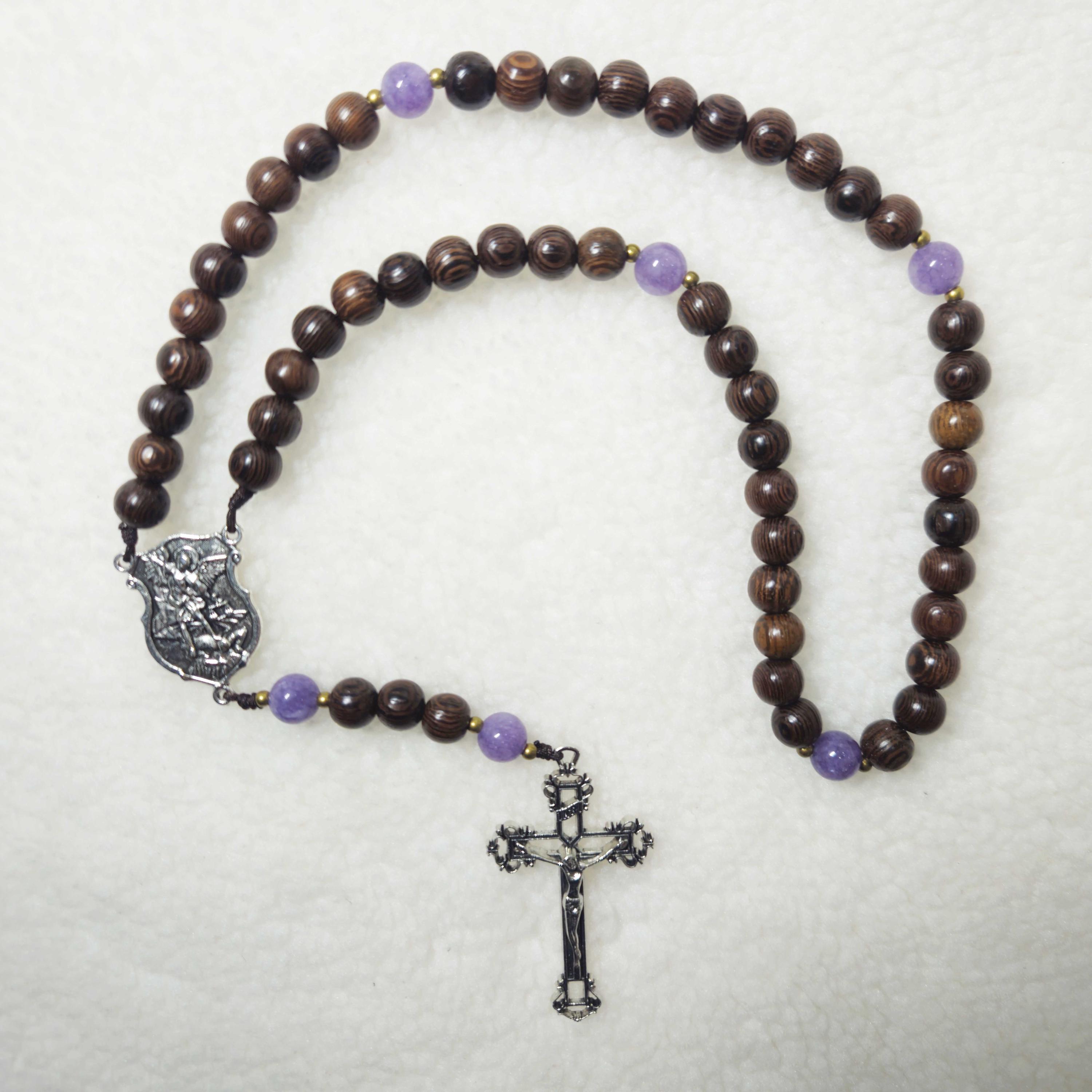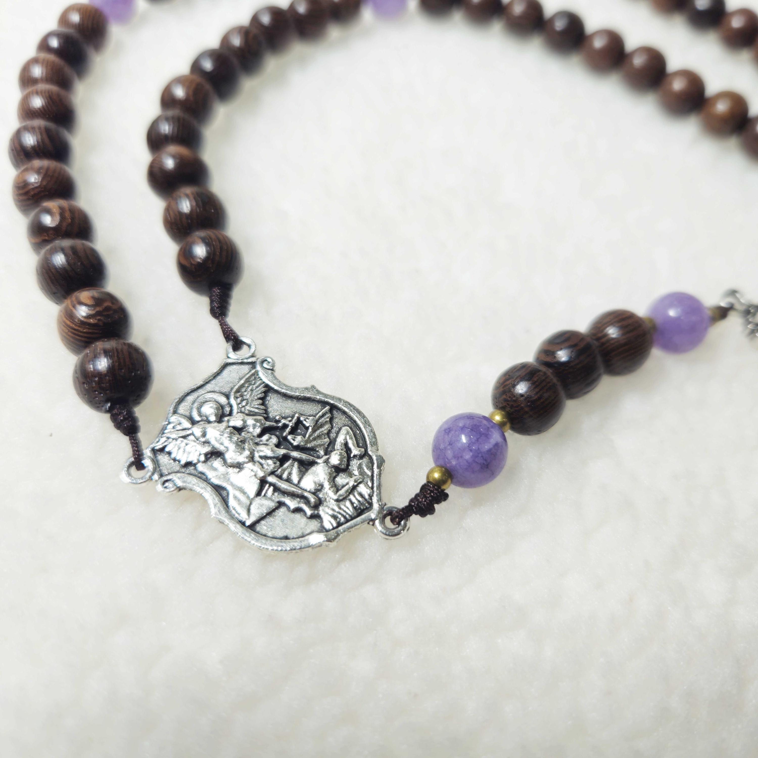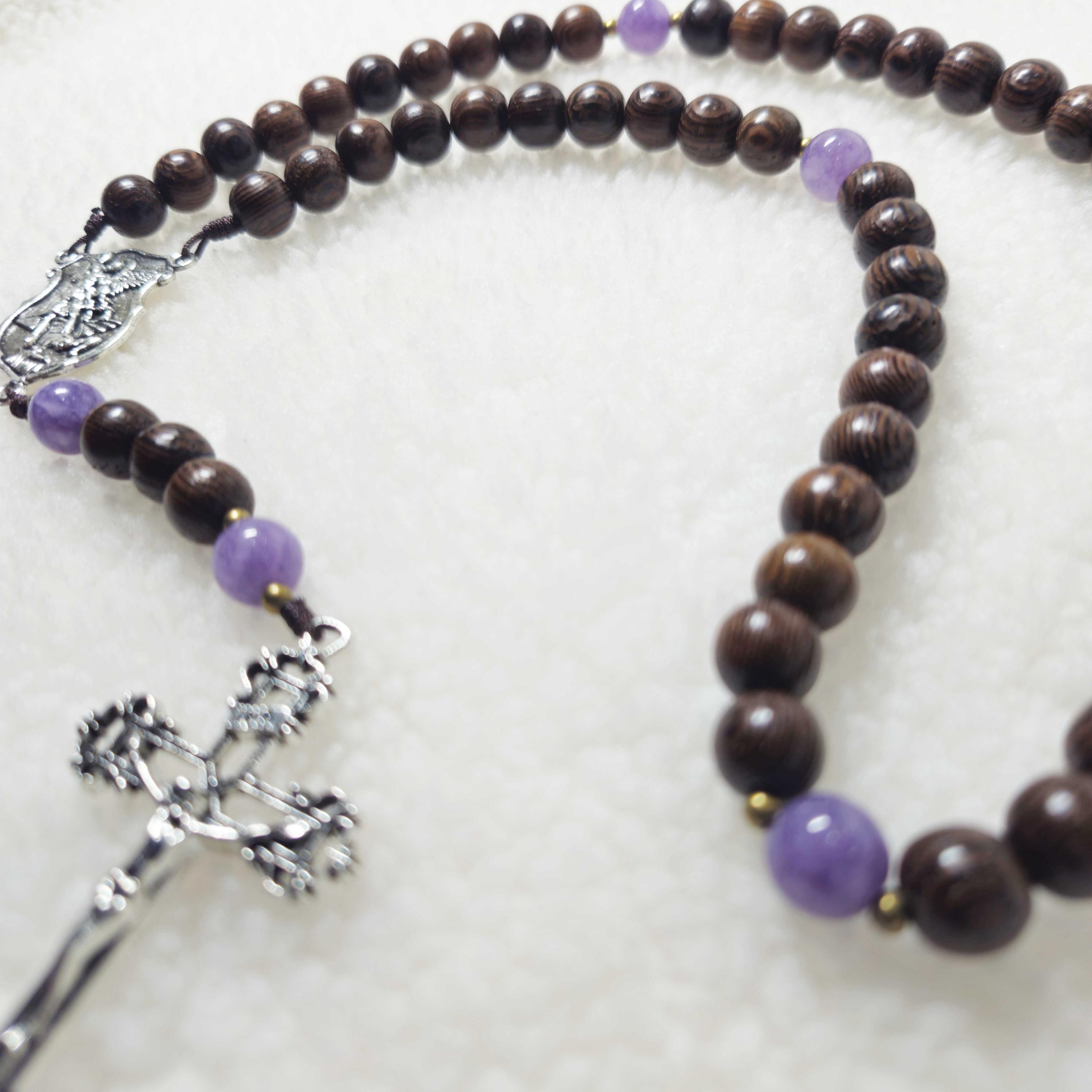 Enhance your prayer life with this exquisite Saint Michael rosary, handcrafted from black green cypress wood beads (8mm) and accented with purple stone beads. Featuring a 2-inch crucifix and a Saint Michael medal, this rosary is perfect for daily devotion, spiritual reflection, or as a meaningful Catholic gift for loved ones. Ideal for prayer, confirmation, or special occasions, it brings a tangible sense of faith and protection to your sacred space. Each rosary is carefully crafted to ensure both beauty and durability.