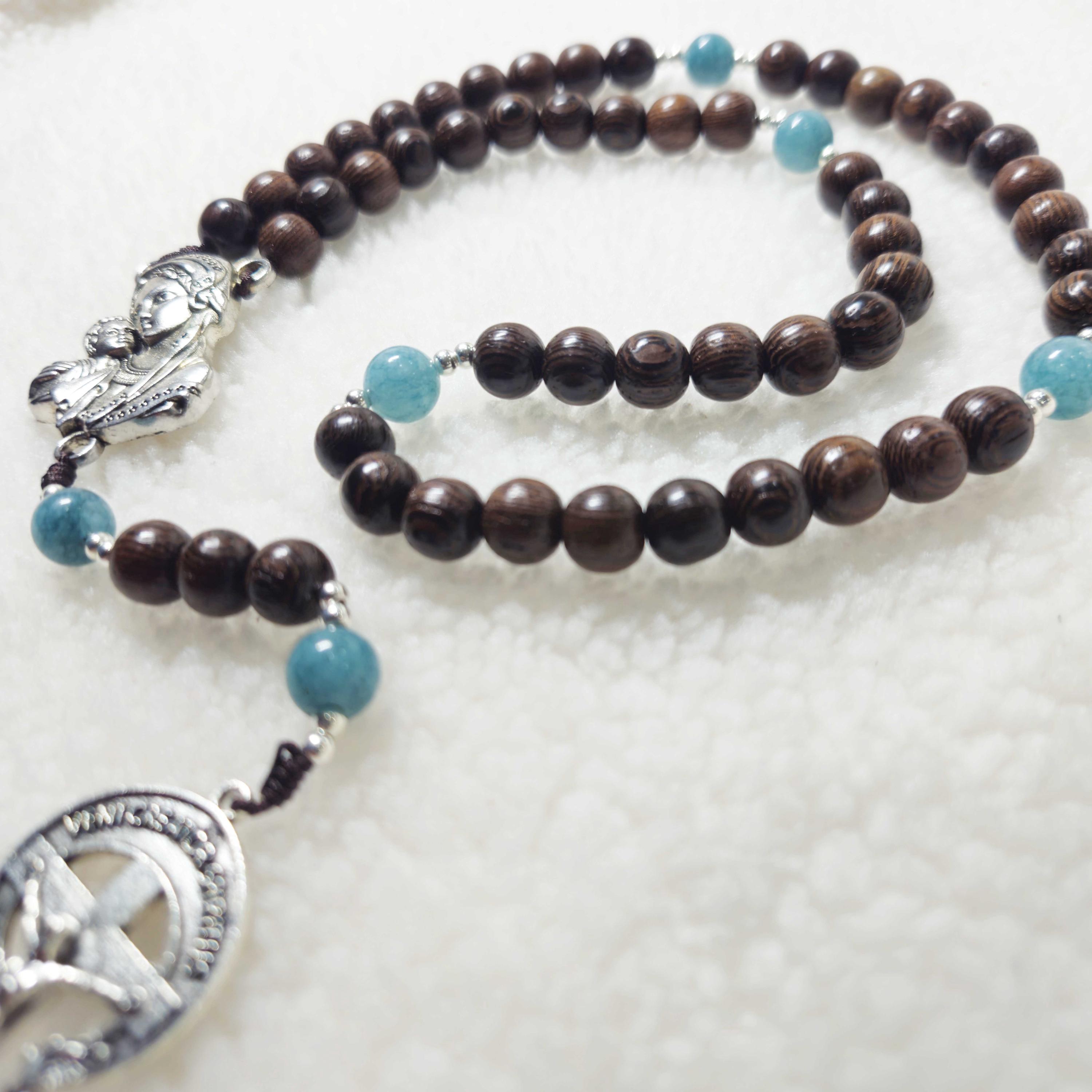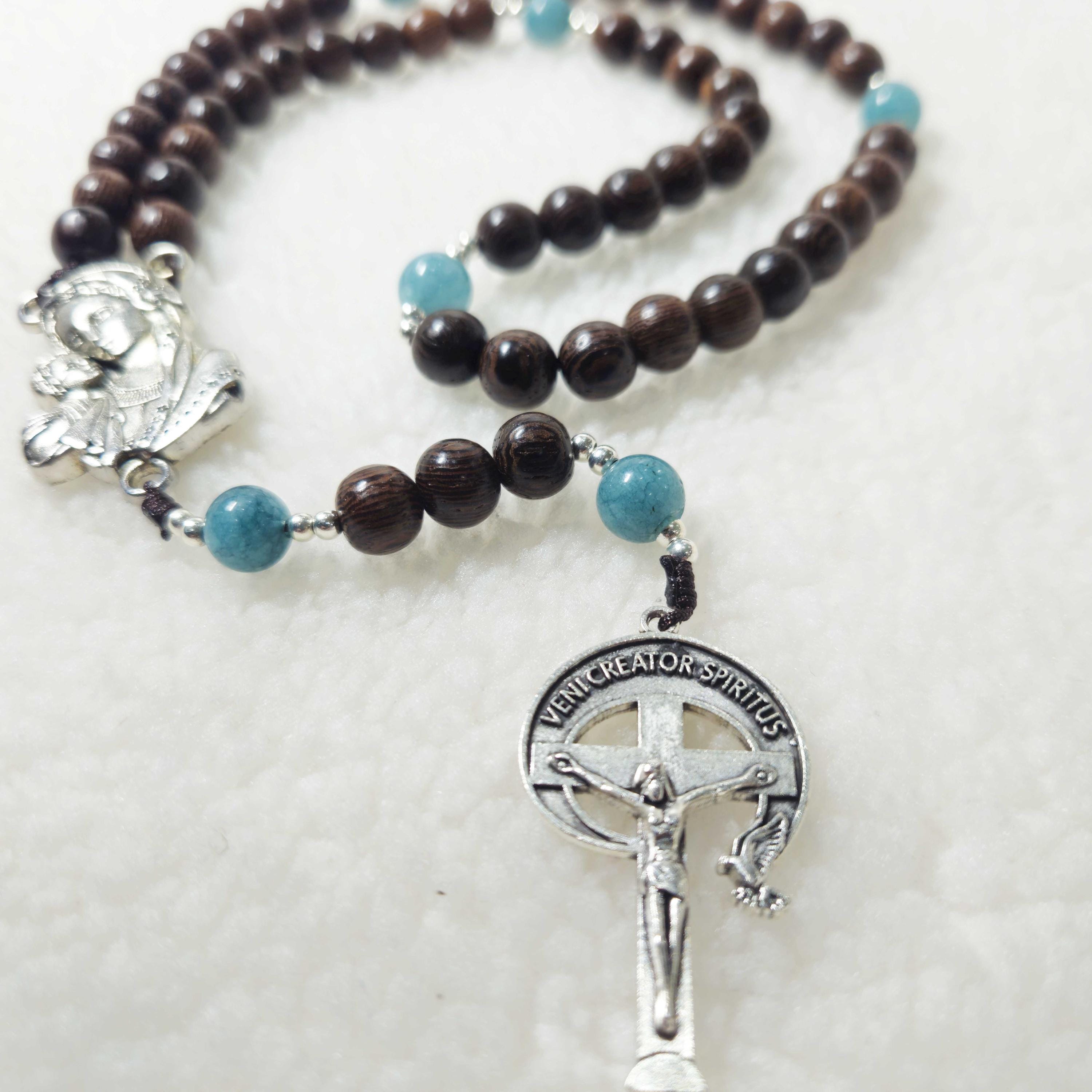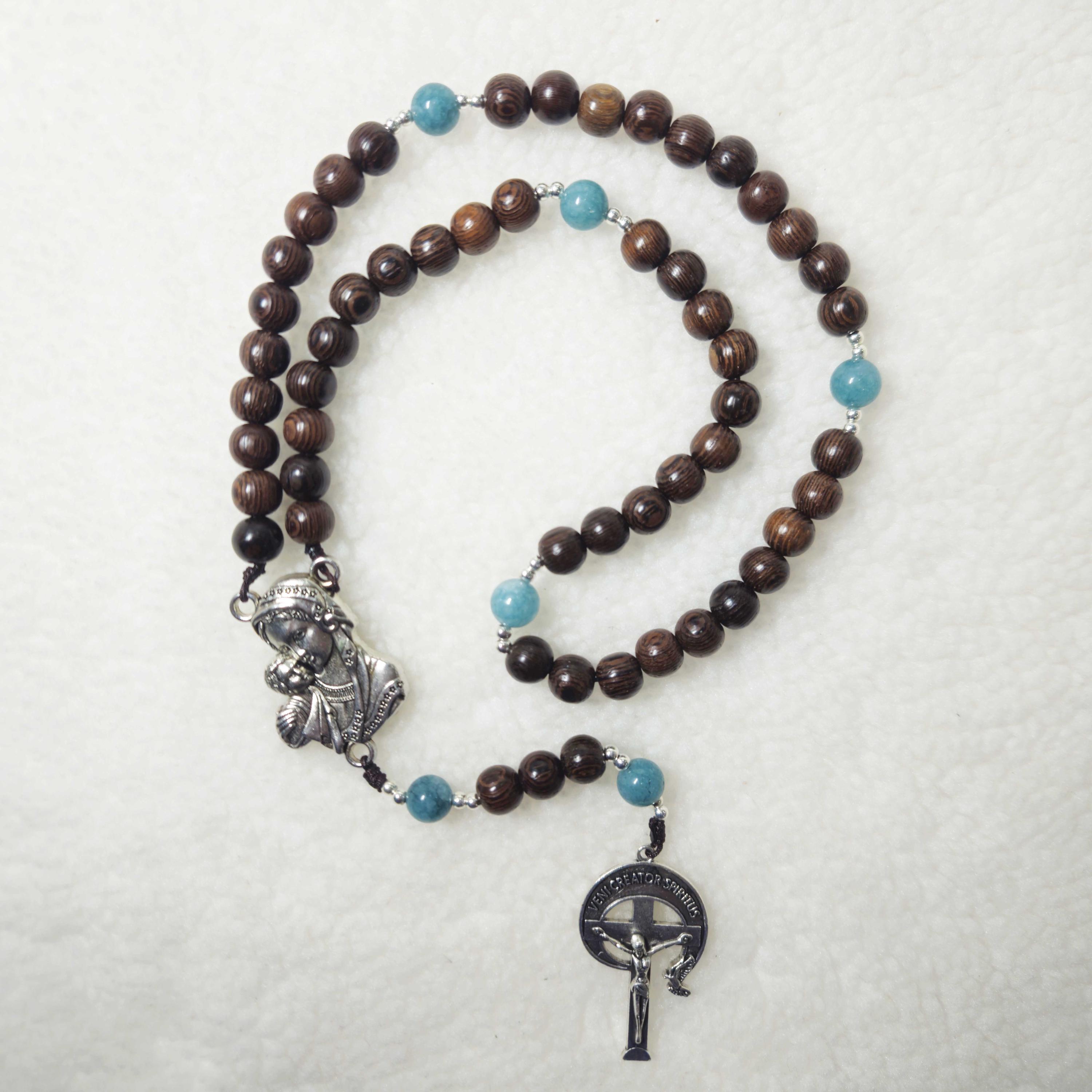 Deepen your moments of prayer with this beautifully handcrafted Catholic rosary. The beads are made from 8mm black green cypress wood, offering a smooth, natural texture. Each Our Father bead is crafted from emerald-colored stone, adding a meaningful and elegant touch.