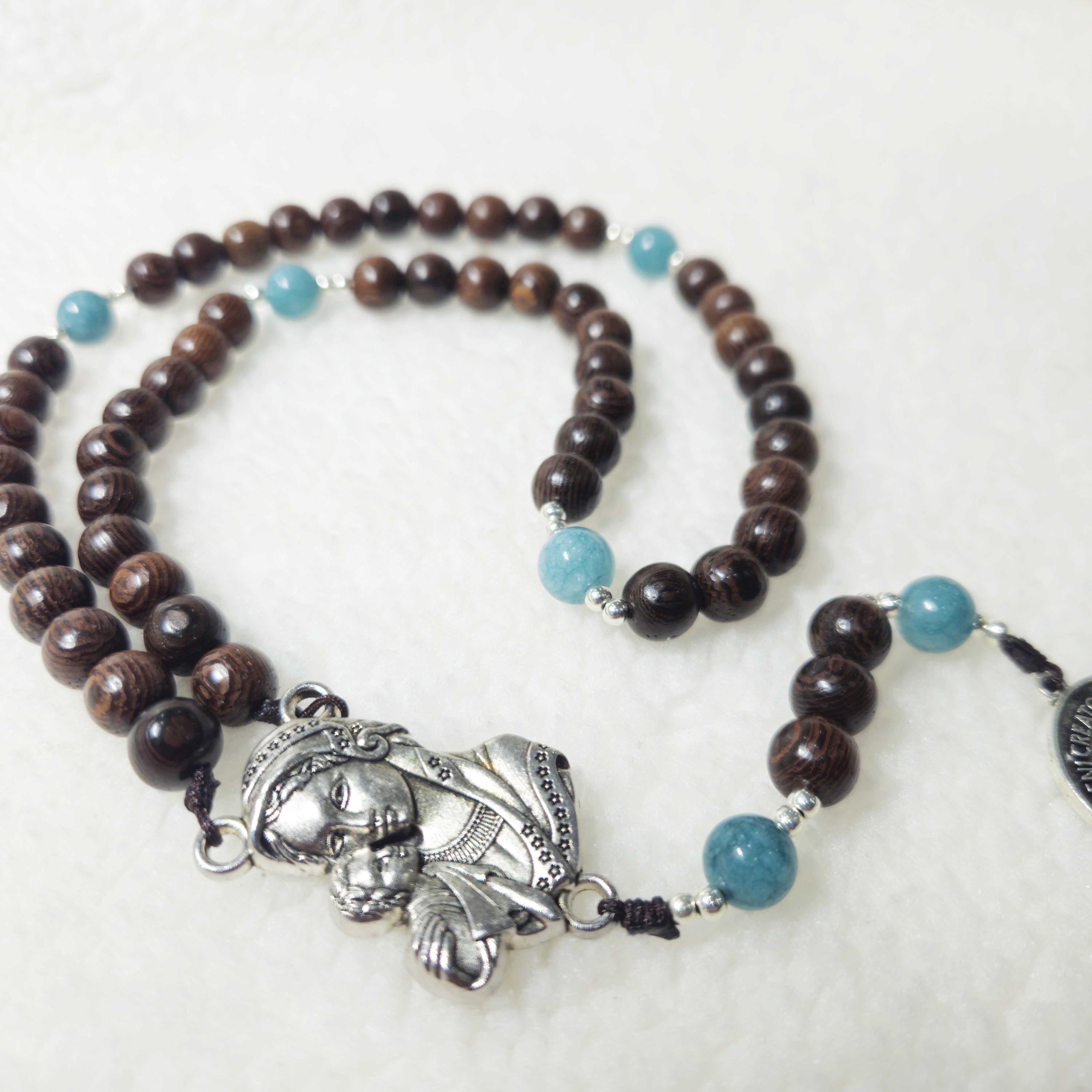 This rosary features a 1.6-inch crucifix and a detailed 1.5-inch medal of the Virgin Mary holding the Child Jesus, making it a devotional piece rich in symbolism.
