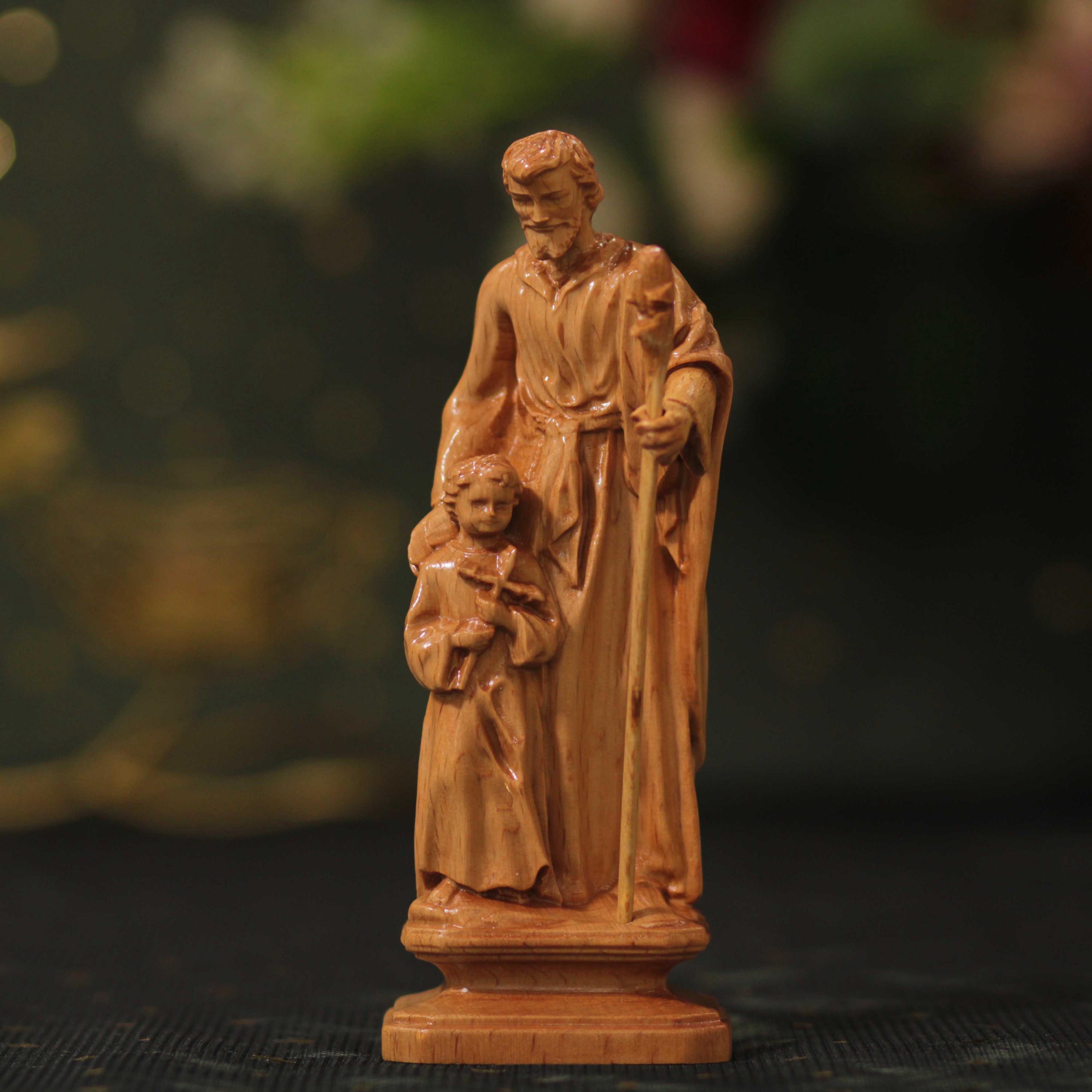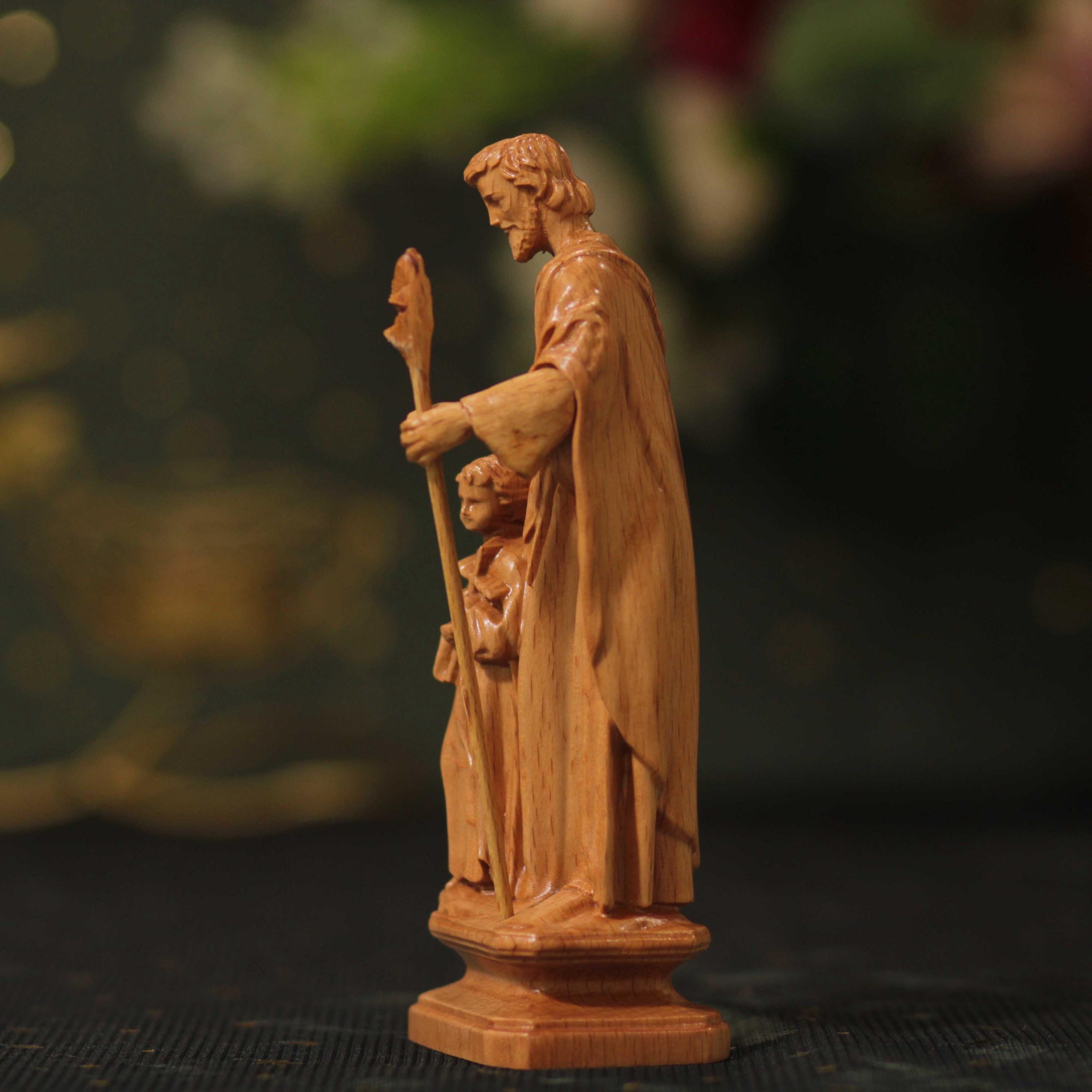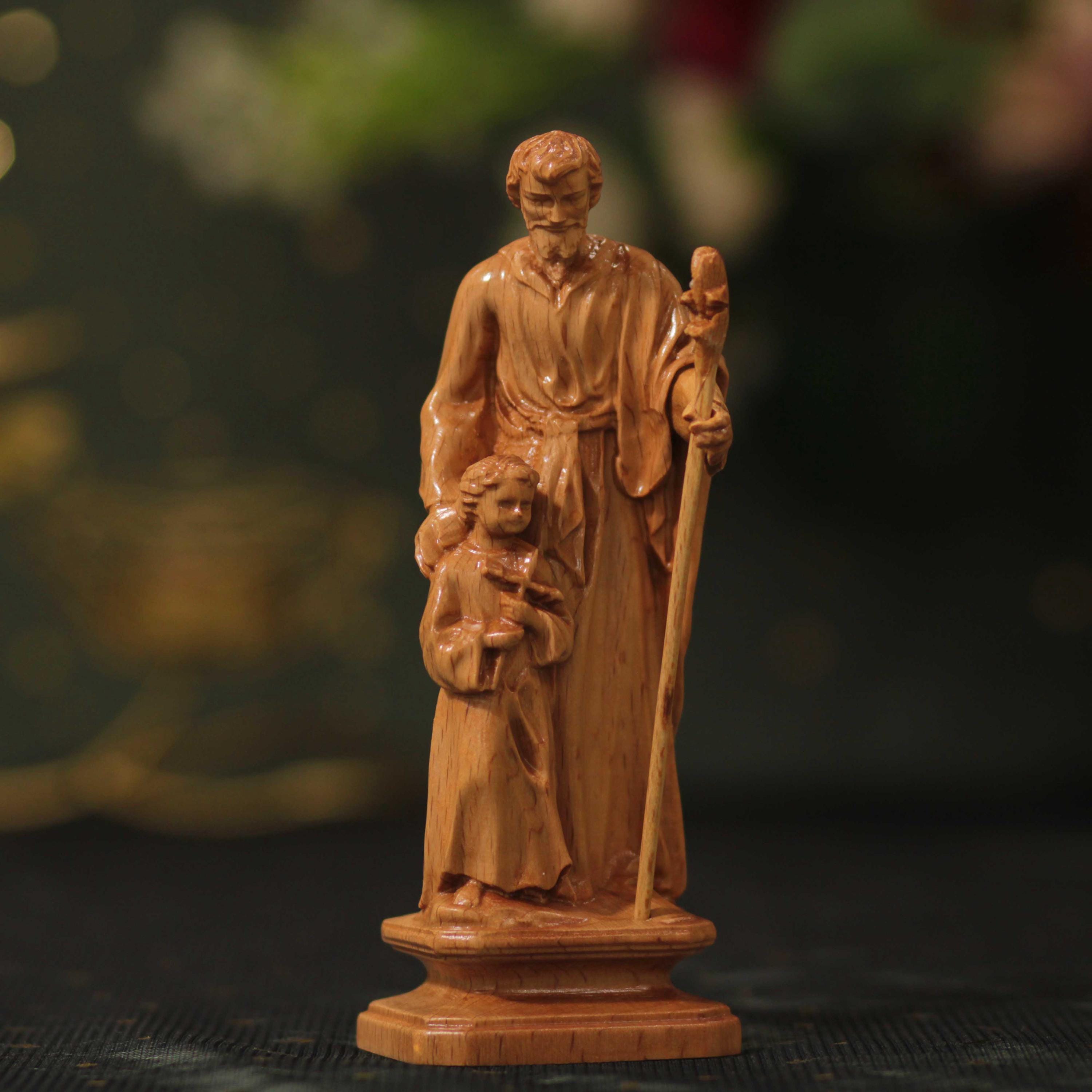 Saint Joseph the Worker and Baby Jesus Small Catholic Wooden Statue– Hand-Carved Christian Home Décor Gift