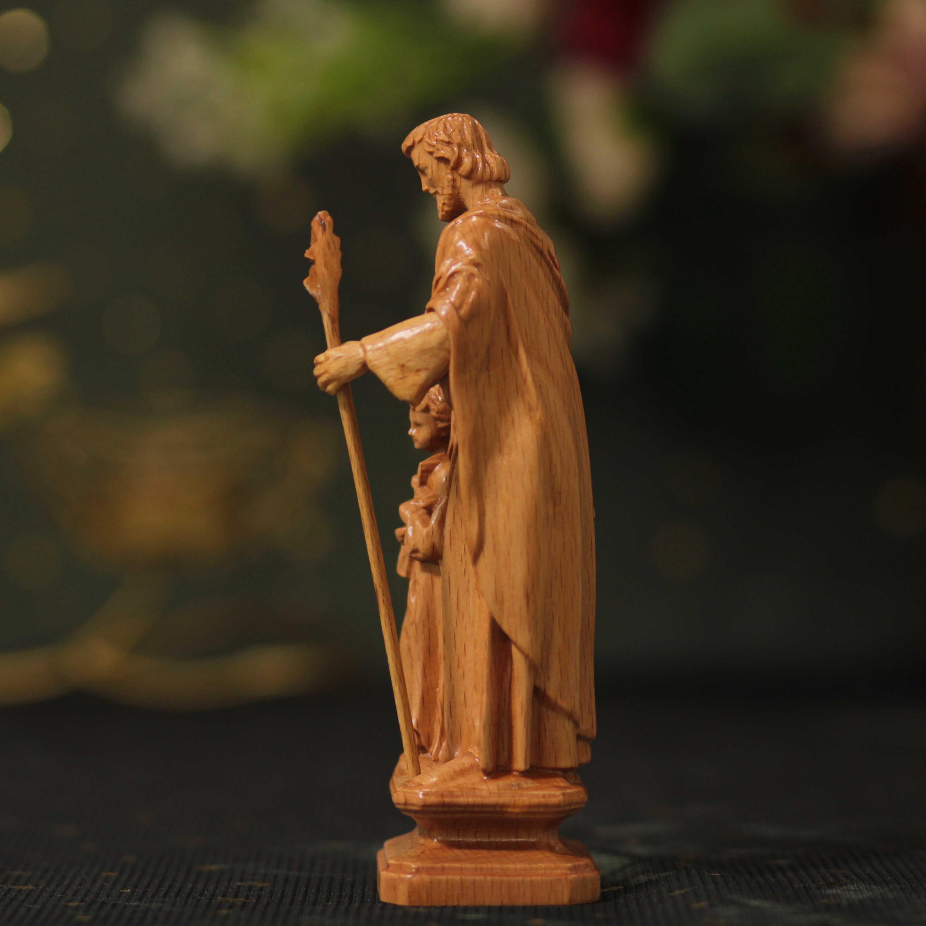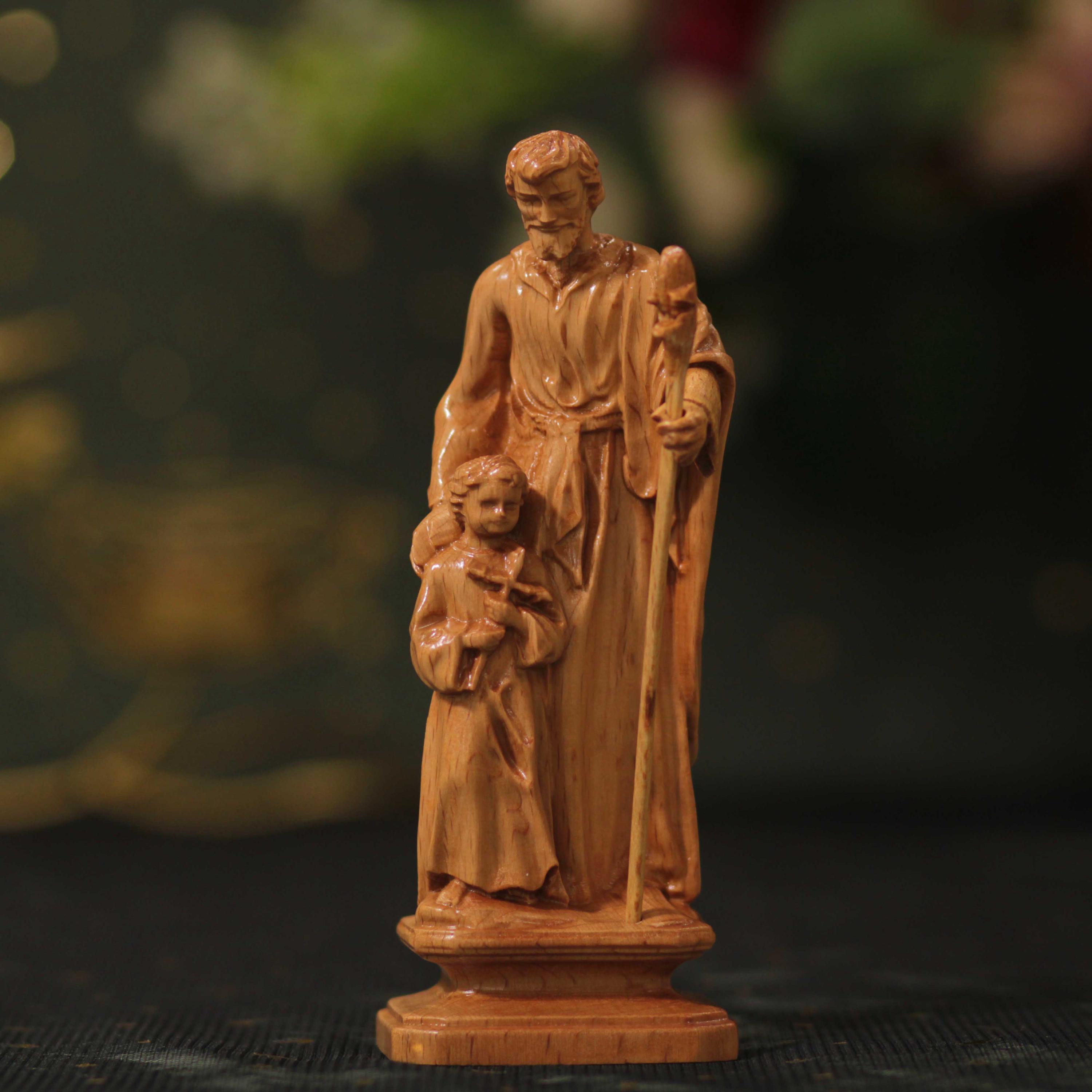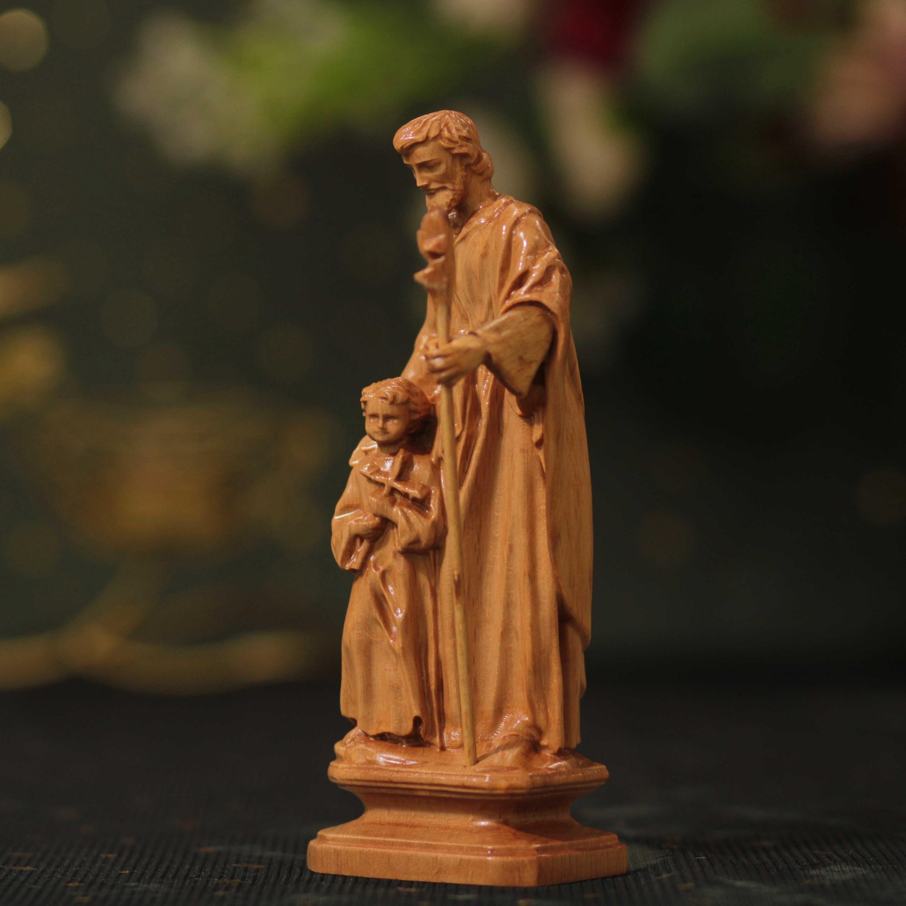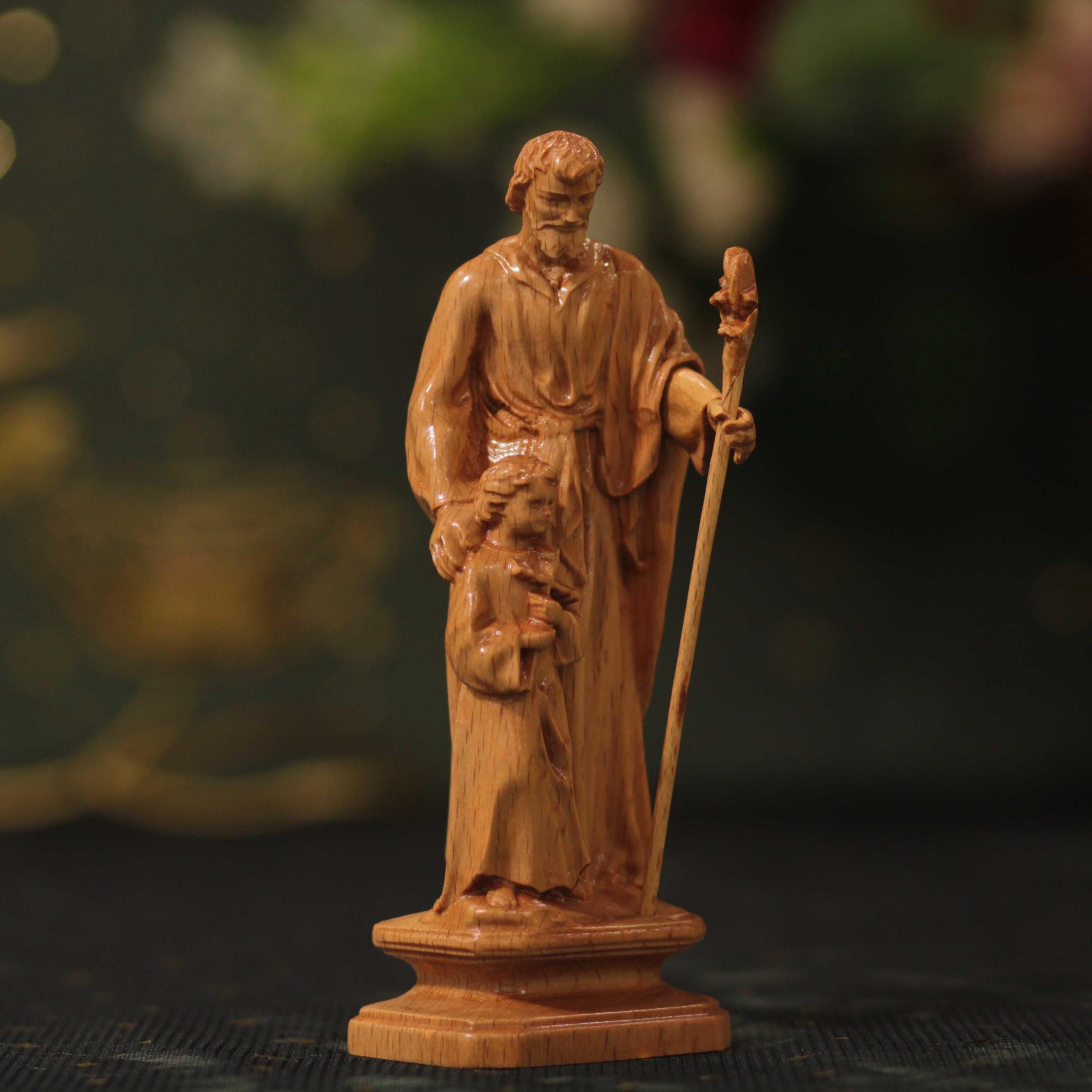 Saint Joseph the Worker and Baby Jesus Small Catholic Wooden Statue– Hand-Carved Christian Home Décor Gift