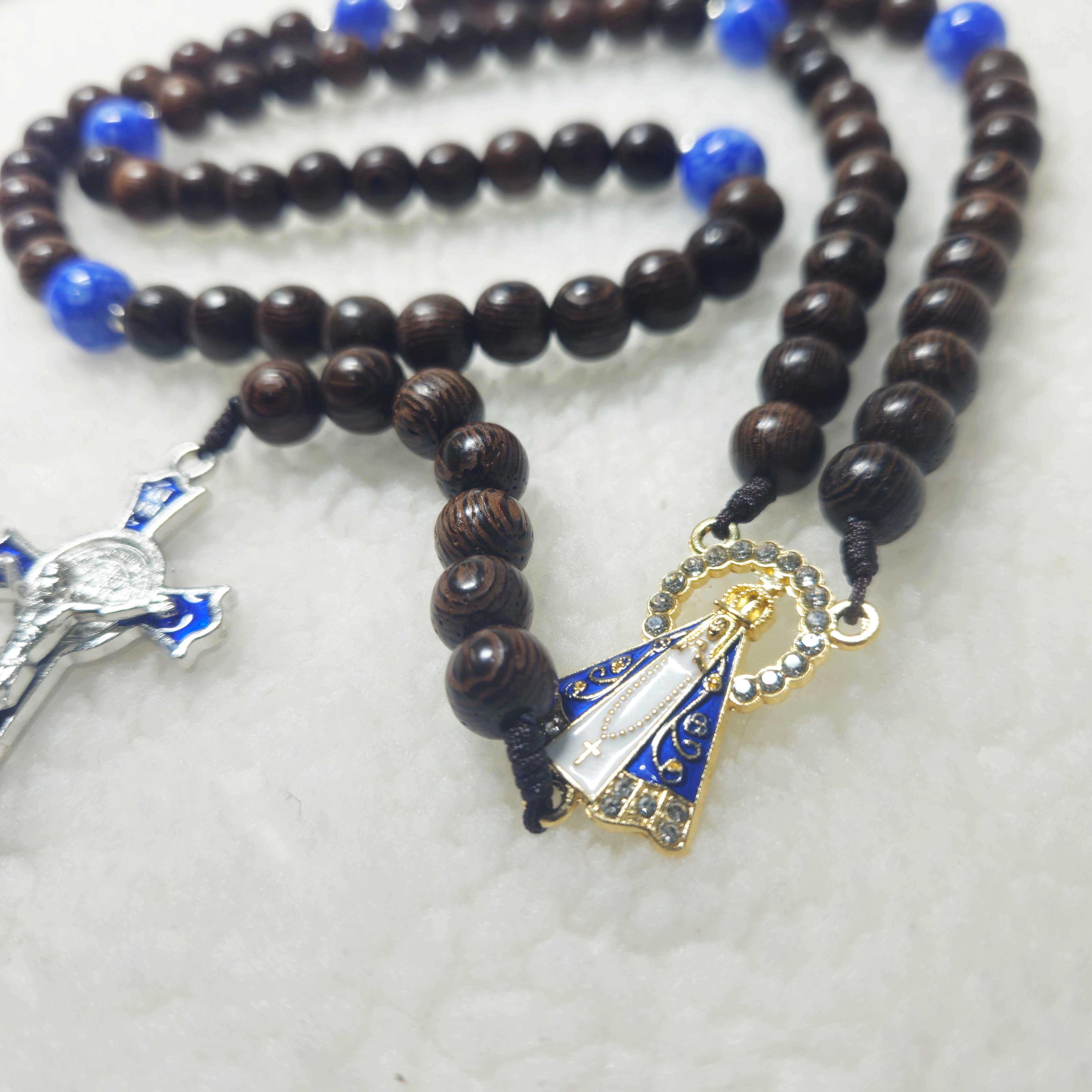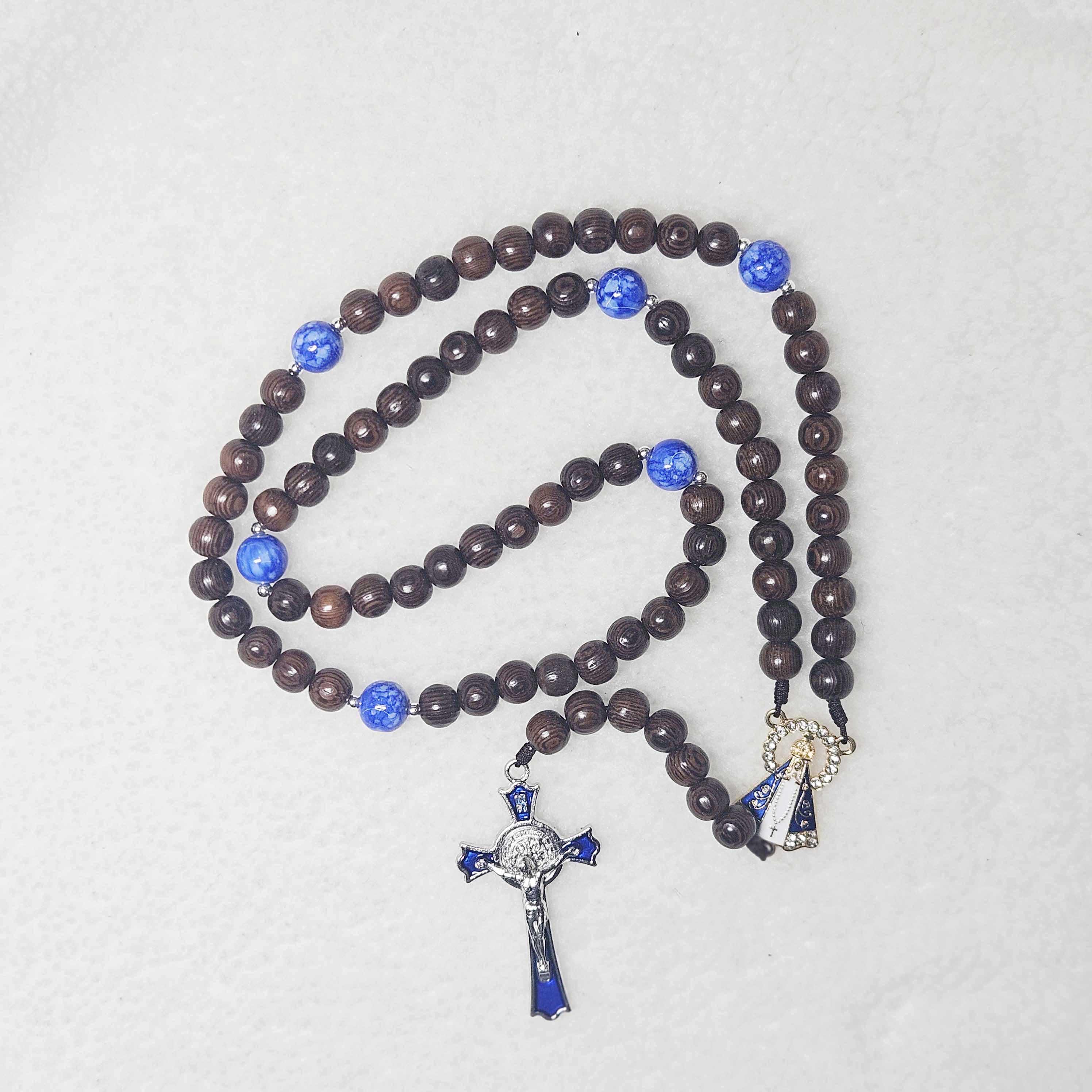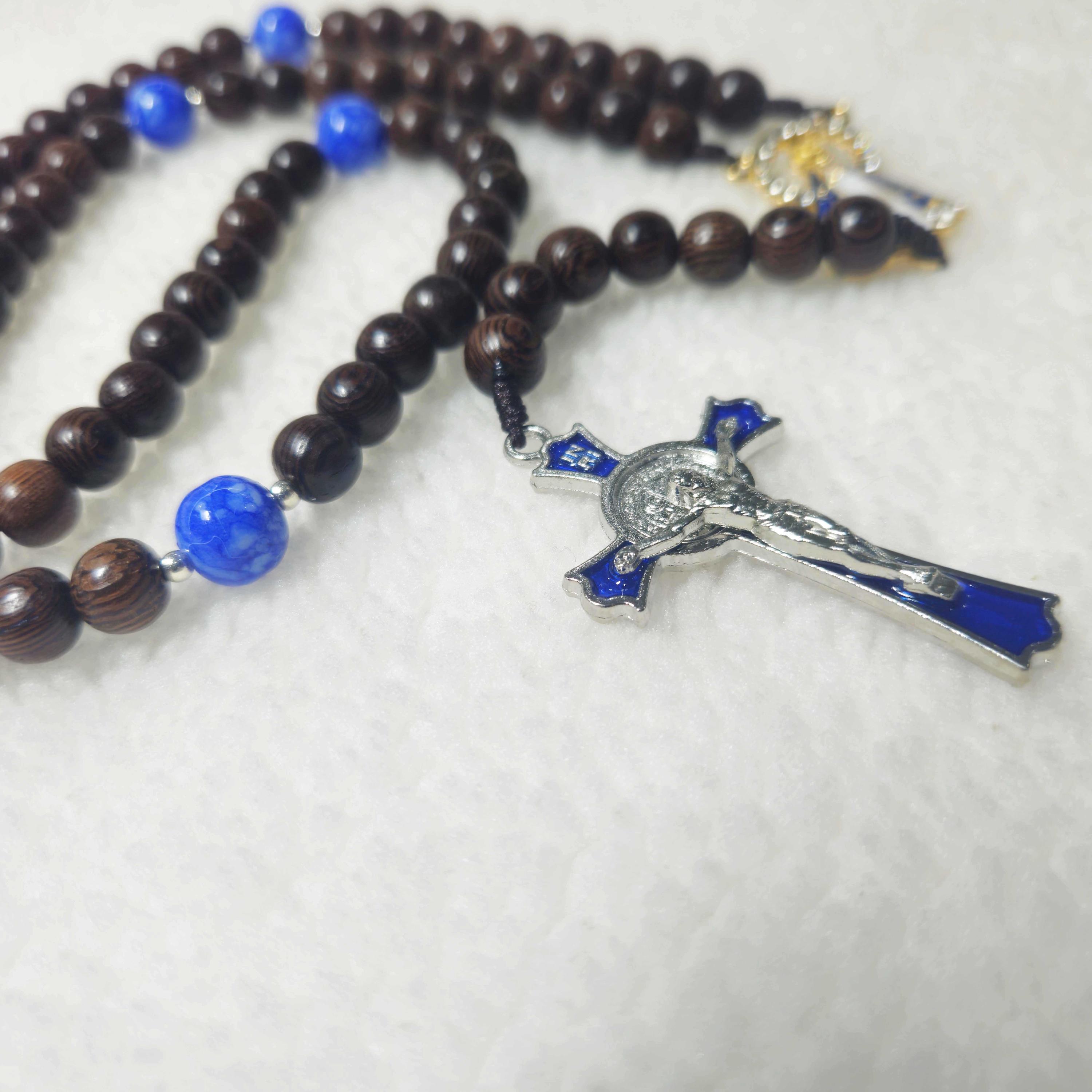 Experience a beautiful devotional companion with this 77-Hail Mary Rosary, thoughtfully handcrafted for prayer, meditation, and special intentions. This unique rosary combines the elegance of blue stone beads with the natural warmth of 8mm black cypress wood beads, creating a timeless and meaningful piece for daily prayer.
