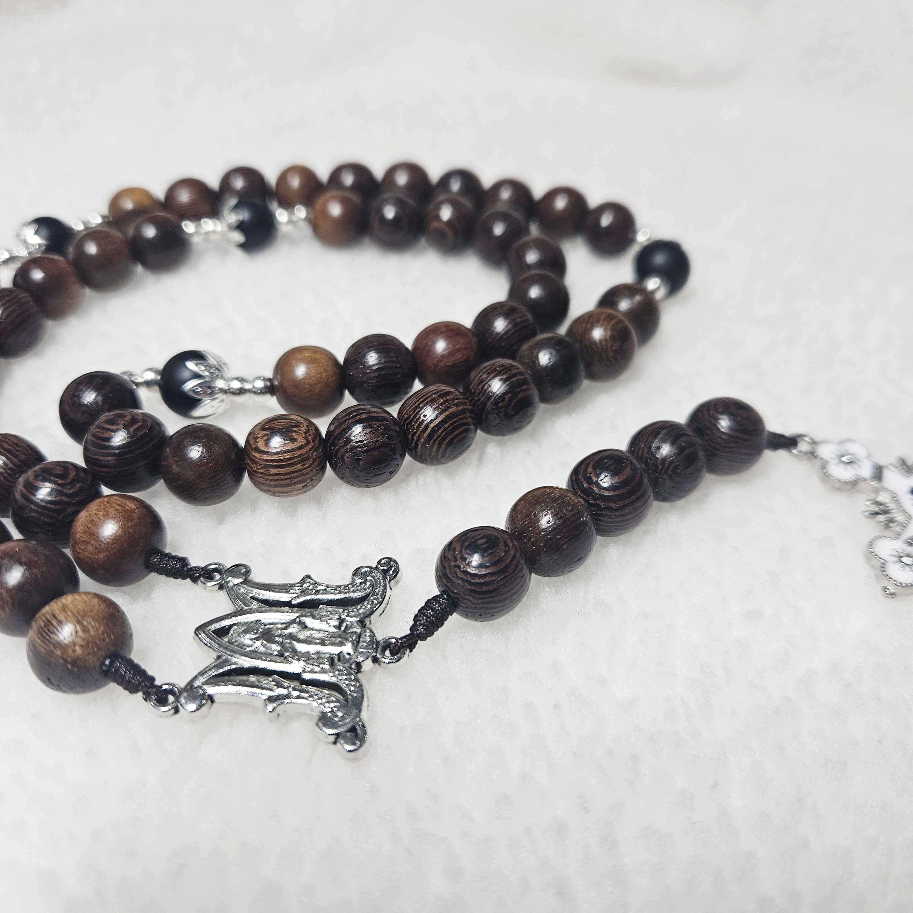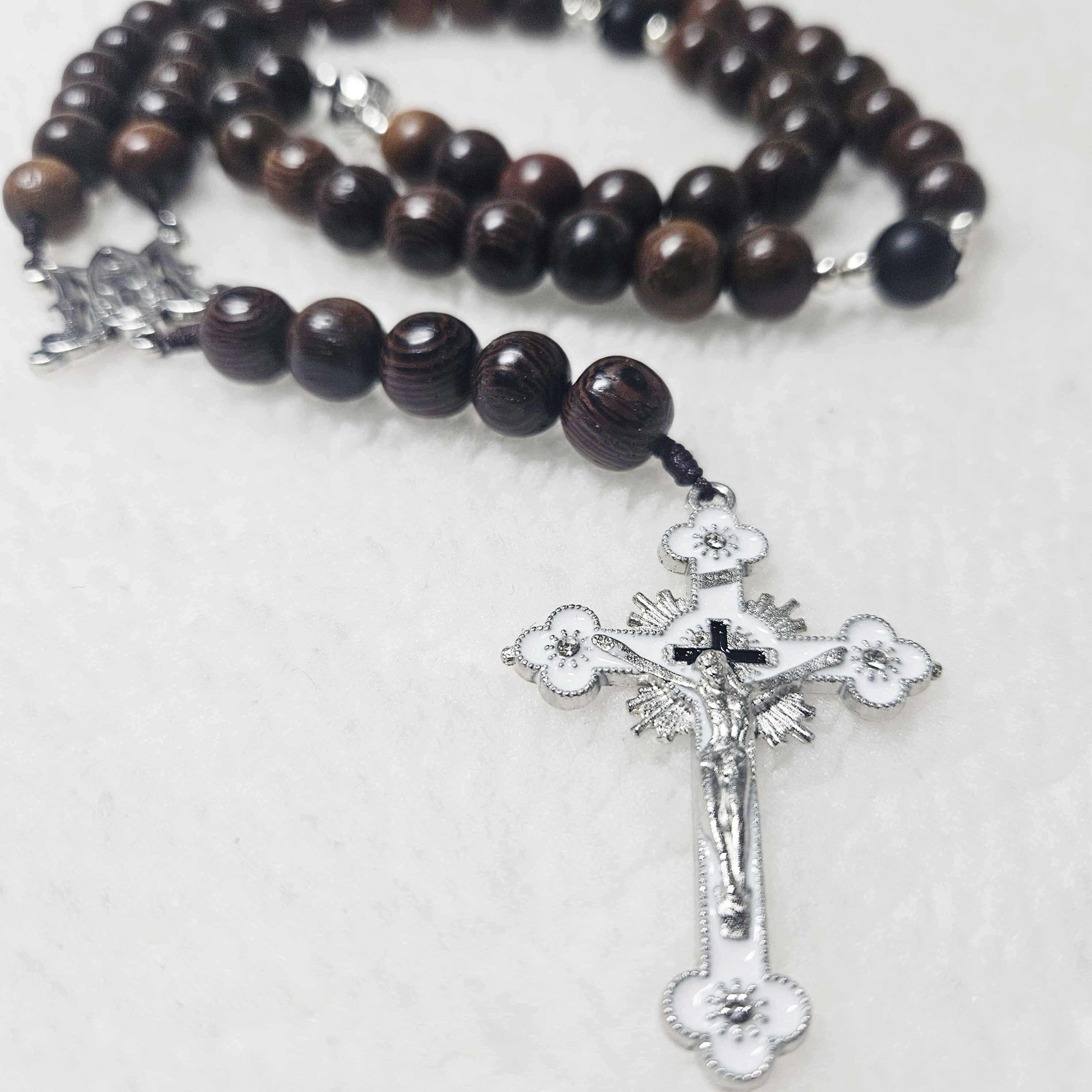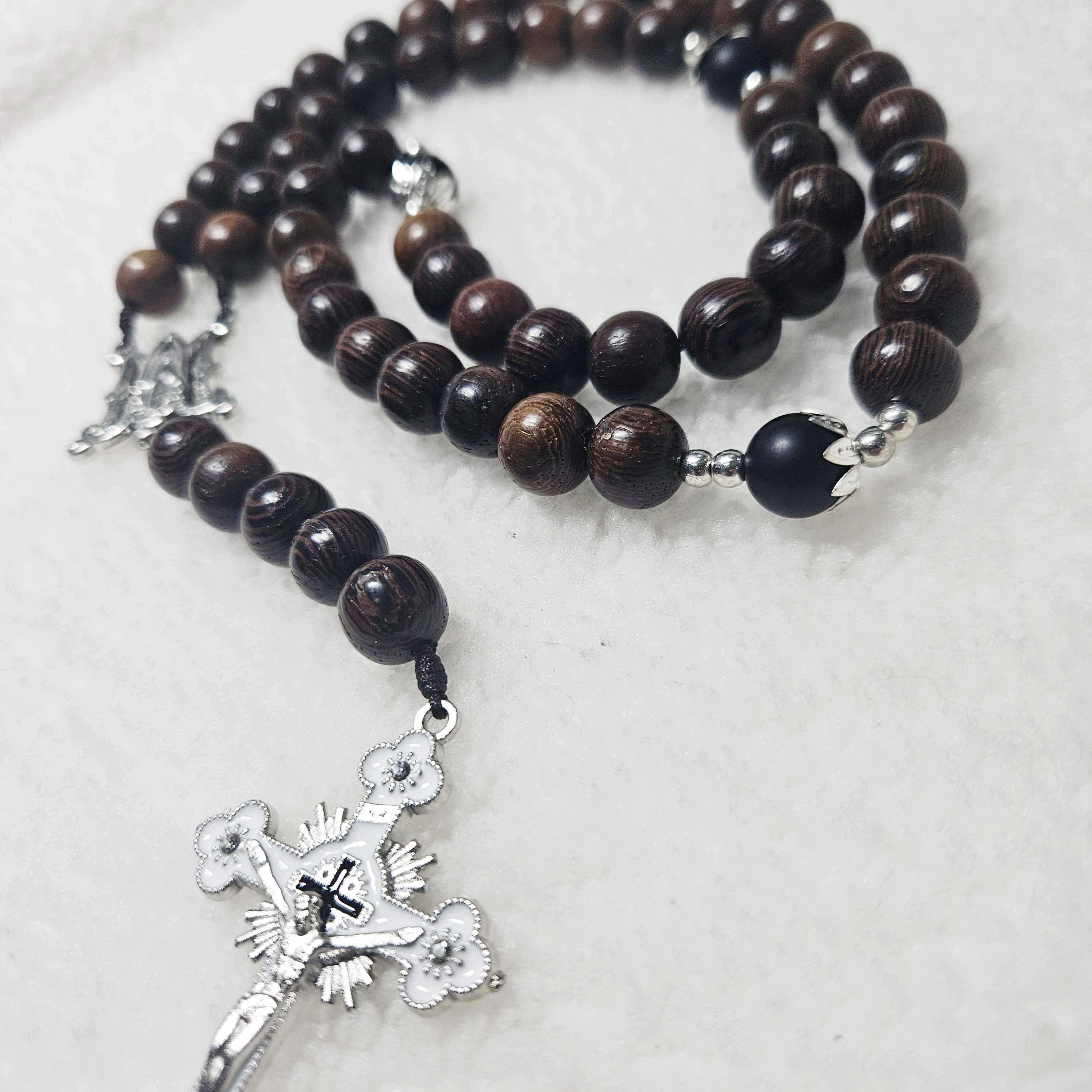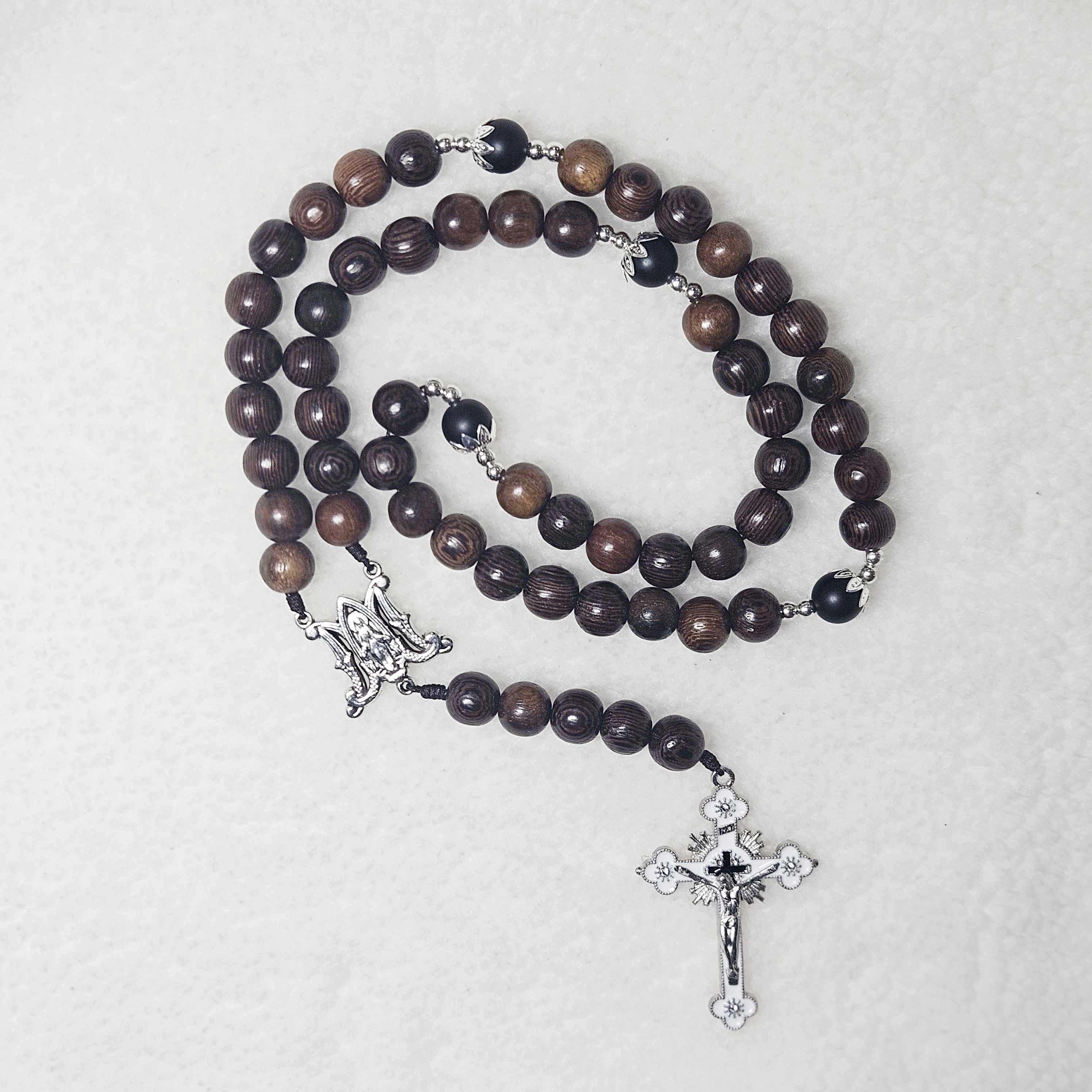 Black Stone Catholic Rosary with 2.2” Crucifix, Our Lady of Grace Medal, and 10mm Black Wood Beads | Handmade Prayer Rosary | Catholic Gift for Men & Women