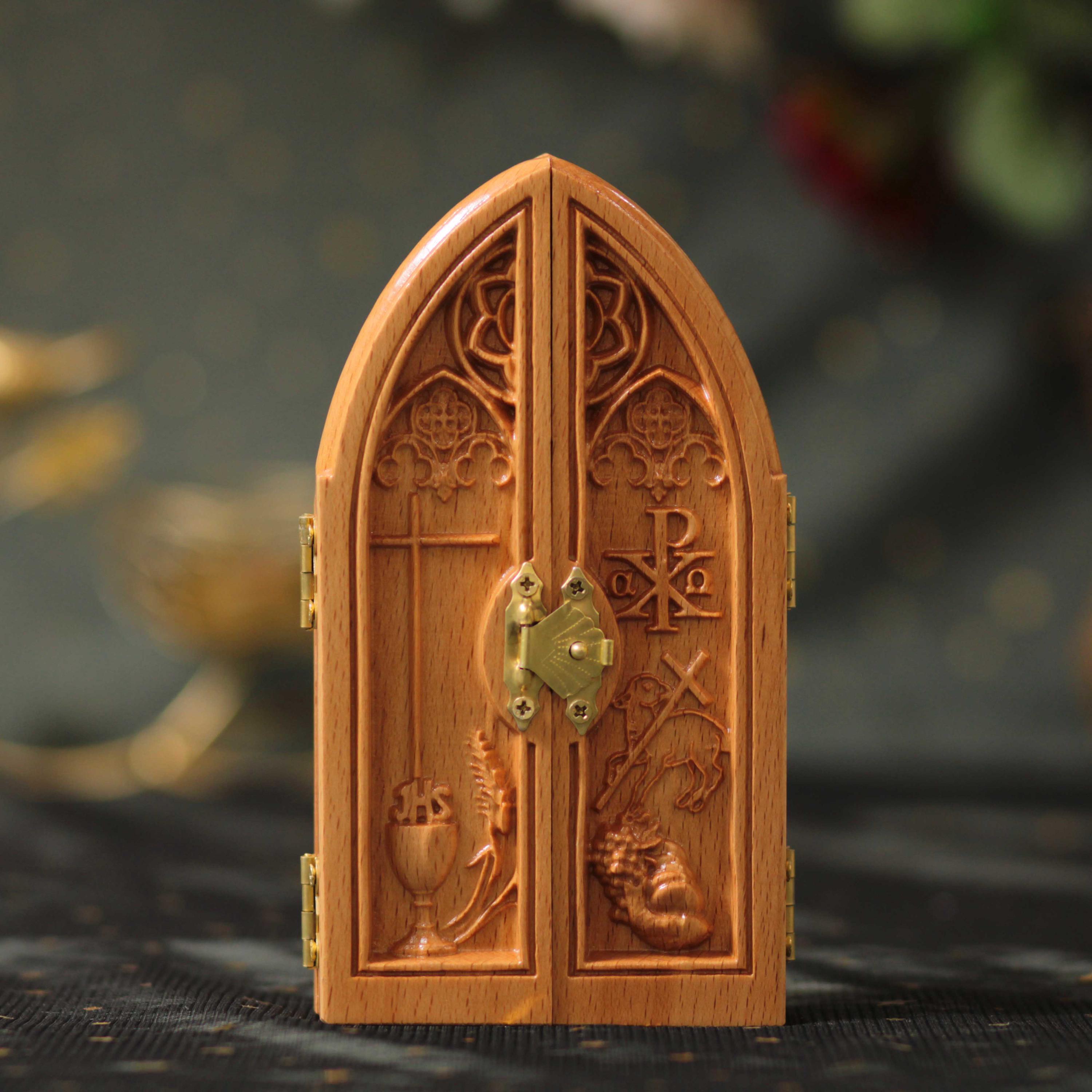 This handcrafted Wooden Catholic Triptych of Christ Triumphant beautifully portrays Our Lord Jesus Christ in glory, accompanied by the Blessed Virgin Mary, Saint Joseph, and holy Angels. Carefully carved from natural wood, this sacred triptych is designed to inspire prayer, faith, and reverence in the Christian home.